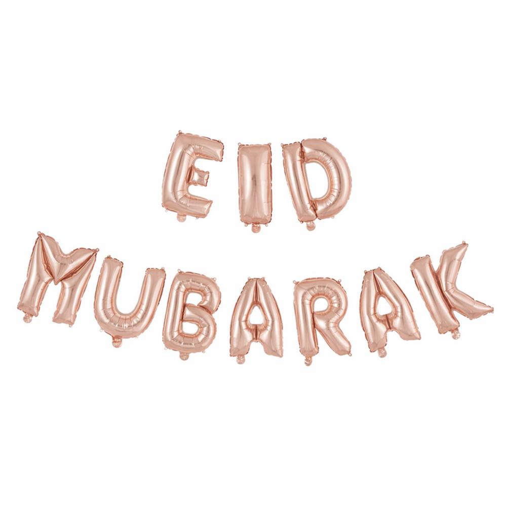Eid Mubarak Ballonggirlander Kit Rosegull inneholder ti rosegullfargede bokstavballonger i folie som danner teksten ”EID MUBARAK”. Ballongene fylles med luft via det medfølgende blåserøret og har løkker for enkel opphenging med det 5 meter lange båndet som følger med.