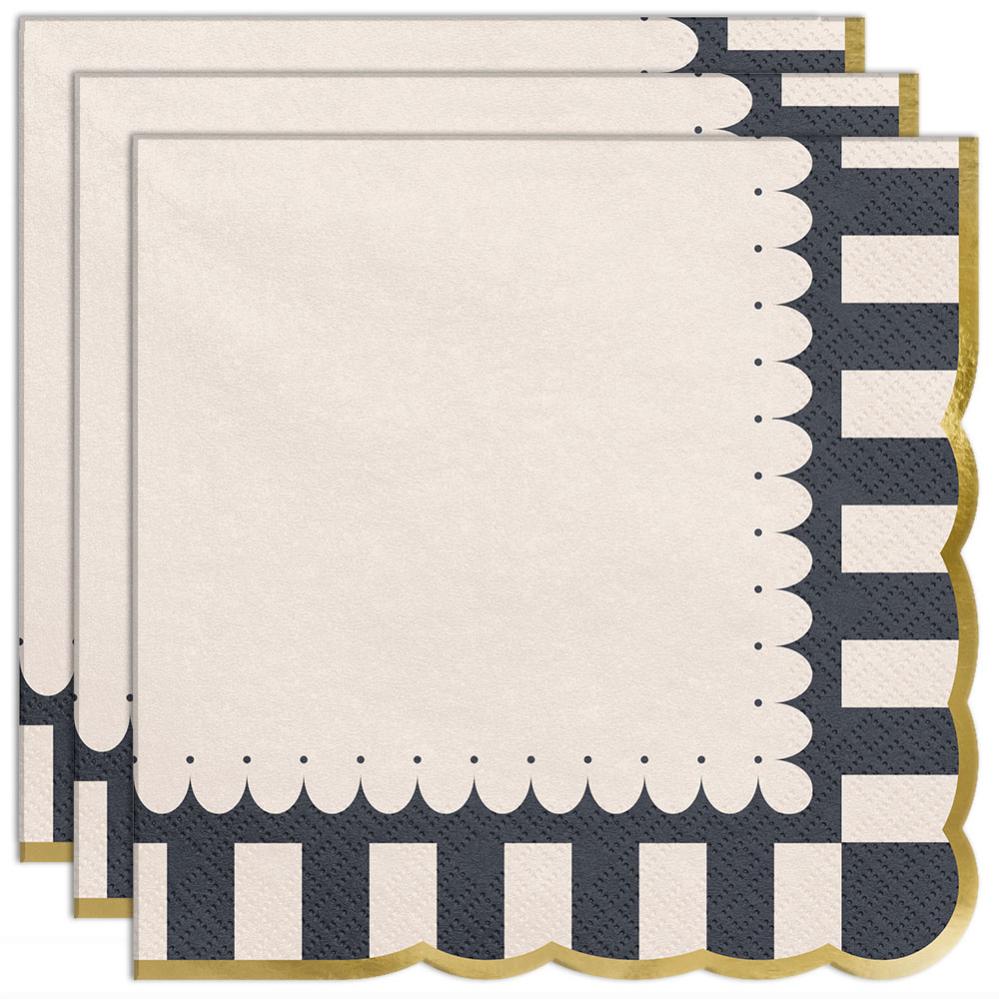 Engangsservietter med Gullkanter 12-pakning inneholder tolv papirservietter i en lys aprikos nyanse. Hver serviett er dekorert med en gullfarget kant, et stripet mønster i svart og lys aprikos samt et scallopmønster i svart.