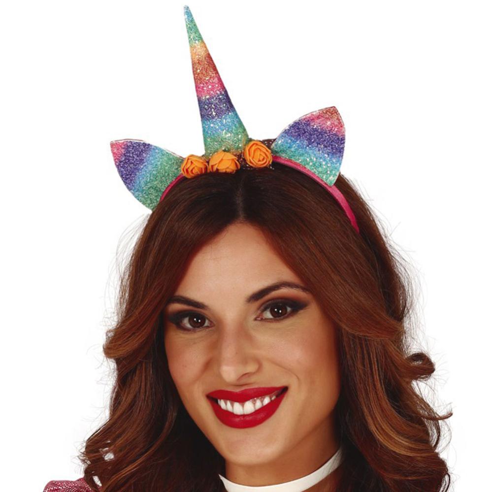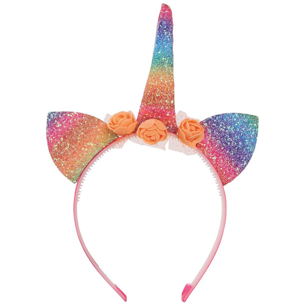 Enhjørning Hårbøyle med Blomster omfatter en rosa hårbøyle med et enhjørningshorn og ører i regnbuefarger samt tre kunstige blomster i lys ferskenfarge.