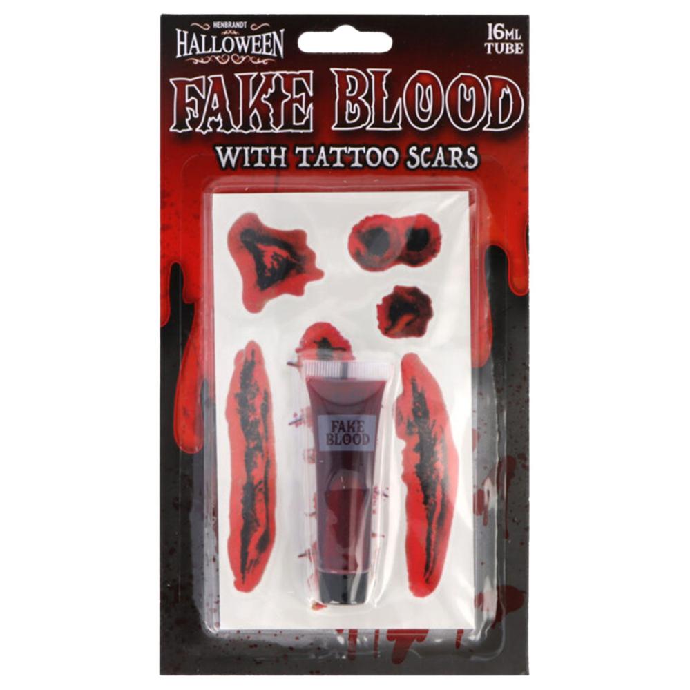 Falskt Blod & Sårtatoveringer Sett omfatter seks midlertidige rivsårstatoveringer og en tube med 16 ml rødt falskt blod.
