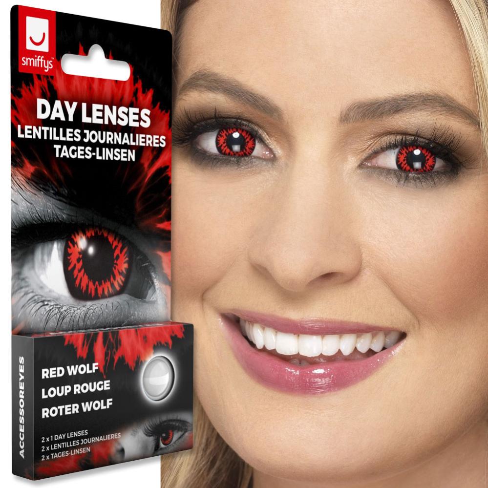 Fargelinser Red Wolf er svarte med rødt mønster over hele linsen. Linsene er holdbare i 3 måneder etter at forpakningen er åpnet. Et godt alternativ for deg som er ute etter et skummelt utseende!