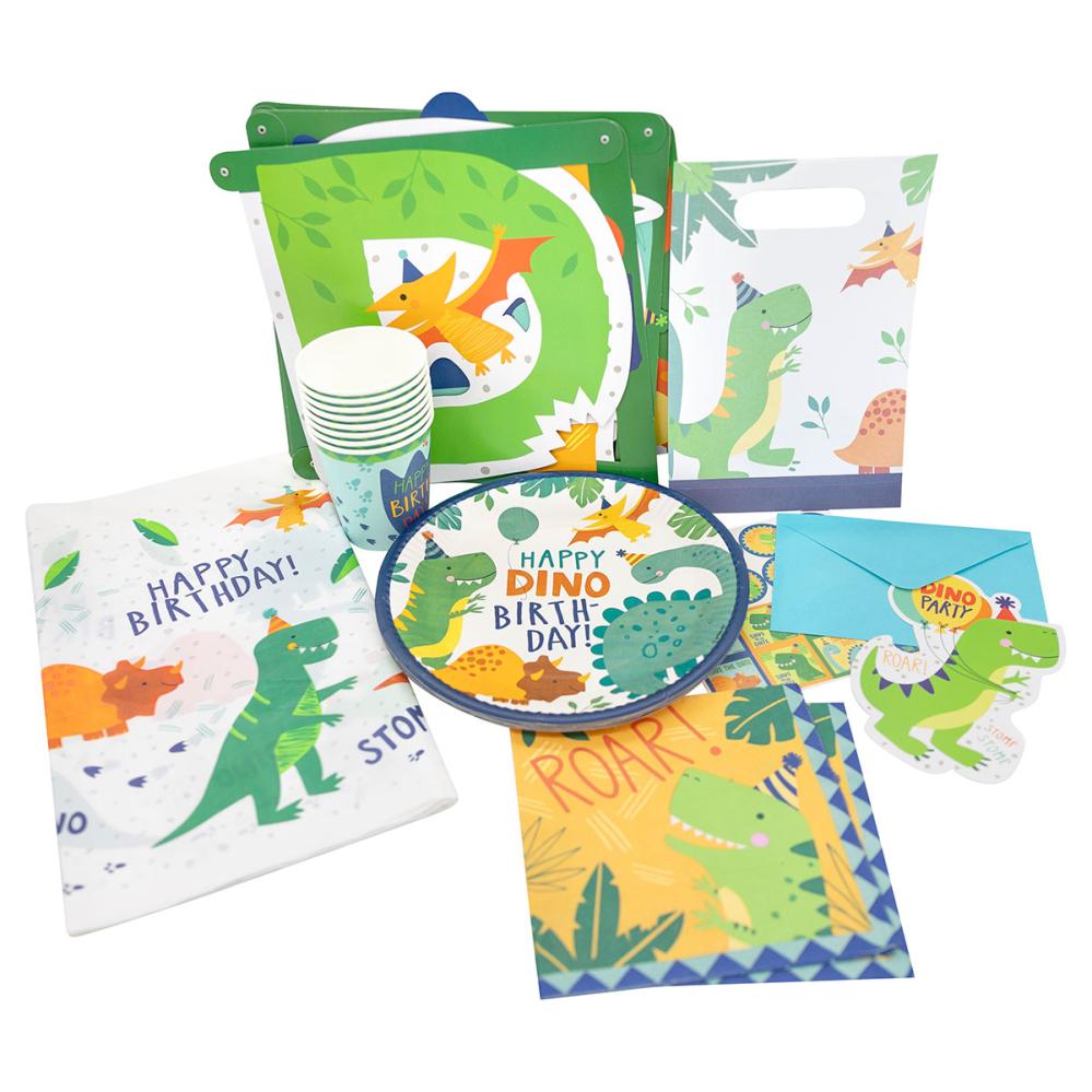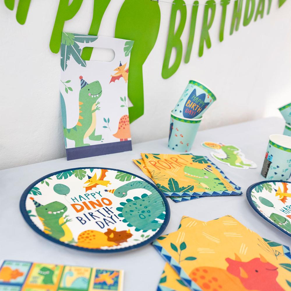 Fargesprakende borddekking med vår festpakke på 51 deler i grønt, oransje, hvitt, blått og turkis fremhever hvert dinosaurmotiv. Tilpass enkelt for en leken dinosaurfest, en spennende dyrefest eller en minneverdig dinosaurbursdag.