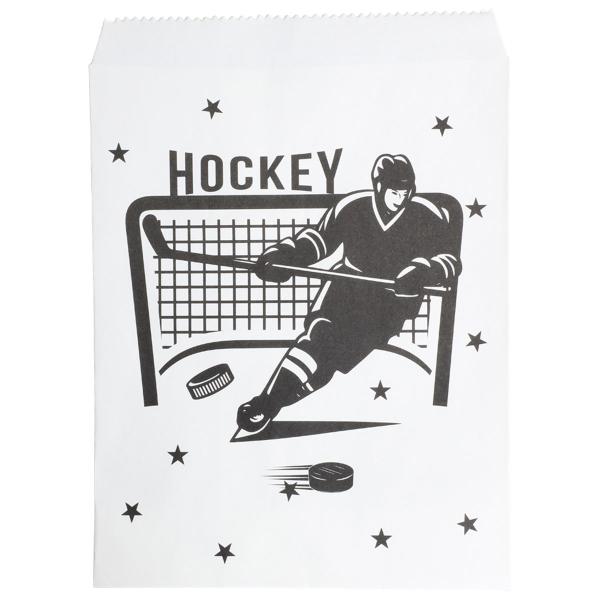 Festposer Hockey 8-pakning består av åtte hvite papirposer med et svart trykk på den ene siden som forestiller en skøytende hockeyspiller, et hockeymål, stjerner samt teksten ”HOCKEY”.