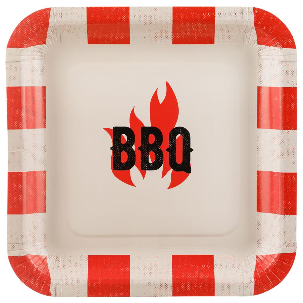 Firkantede Papptallerkener BBQ 6-pakning består av seks beige firkantede engangstallerkener med avrundede hjørner og lett opphøyde kanter. Tallerkenene har rutete røde kanter og er dekorert med teksten 'BBQ' i svart med en flamme i midten.