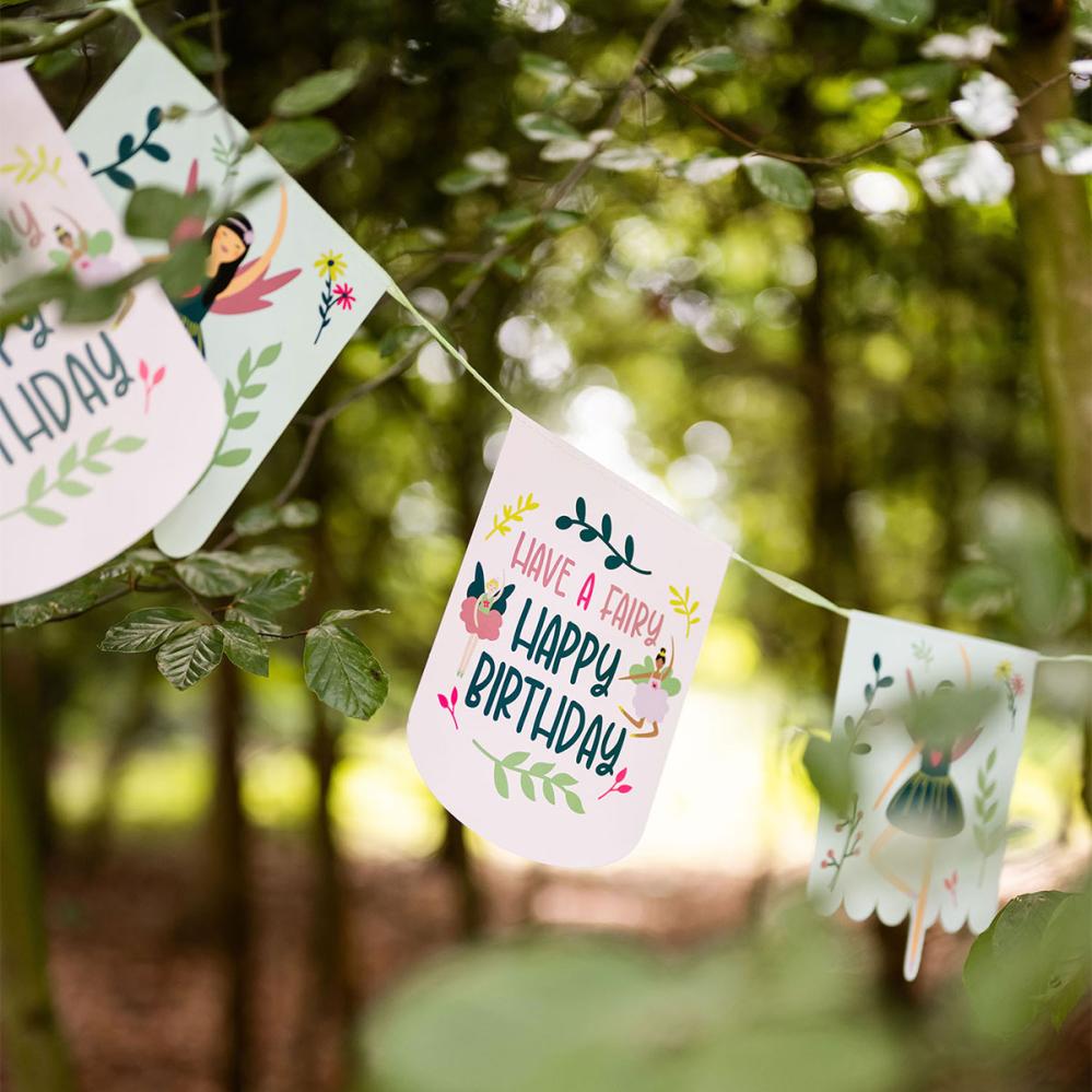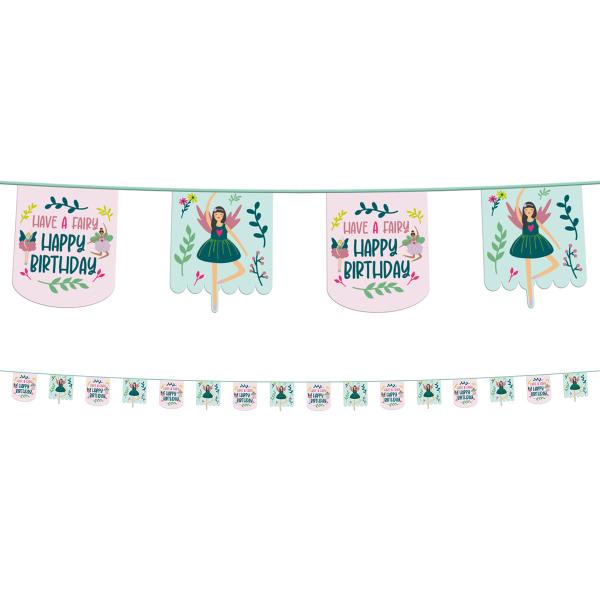 Flaggirlander Fabulous Fairy 6 m omfatter en girlander med totalt 16 flagger som har to ulike alvemotiver. Ett flagg viser en dansende alv med blomster på en salviegrønn bakgrunn, mens det andre har teksten ”Have A Fairy Happy Birthday” og prydes av alver og blomster mot en rosa bakgrunn. Flaggene er festet på et salviegrønt polyesterbånd. Girlanderen måler 6 meter og etterlater cirka 1 meter på hver side for enkel opphenging.