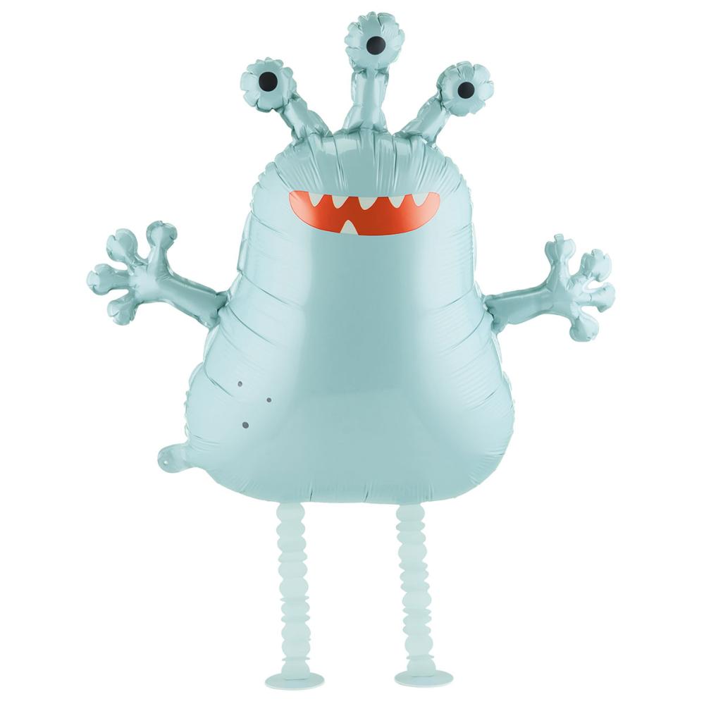 Folieballong Alien Airwalker 58 x 60 cm omfatter en folieballong i form av en disblå alienfigur med små føtter og lange ben som skaper en gående effekt når den fylles med helium. Ballongen kan også fylles med luft og leveres med et sugerør for oppblåsing.