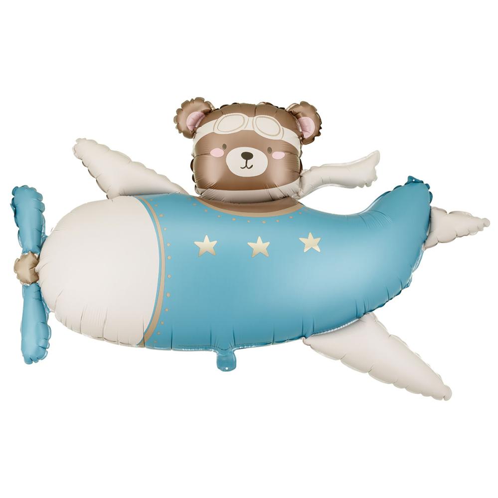 Folieballong Bjørn i Fly Lyseblå 94 x 61 cm består av en folieballong formet som en bjørn som sitter i et fly, designet i myke nyanser av lyseblått og hvitt, med elegante detaljer i gull. Den kan fylles med luft eller helium og leveres med et sugerør for oppblåsing.