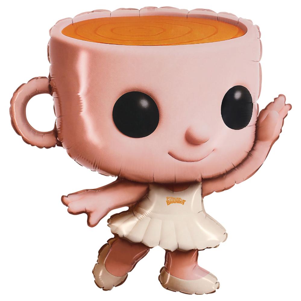Folieballong Brainrot Ballerina Cappuccina 54 x 56 cm er en folieballong med motiv av en rosa ballerina med en hvit kjole i form av en kaffekopp. Ballongen fylles med luft eller helium.