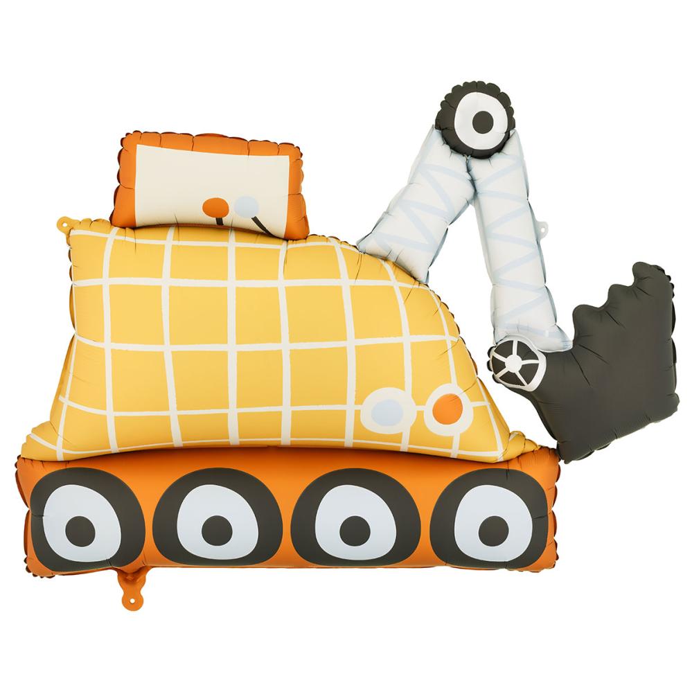 Folieballong Gravemaskin 93 x 68 cm er en ballong formet som en gulrutete gravemaskin med oransje topp og bunn samt svarte dekk. Graveskuffen er svart og halsen har lyseblå slynger. Ballongen fylles med luft via det medfølgende blåserøret eller med helium.