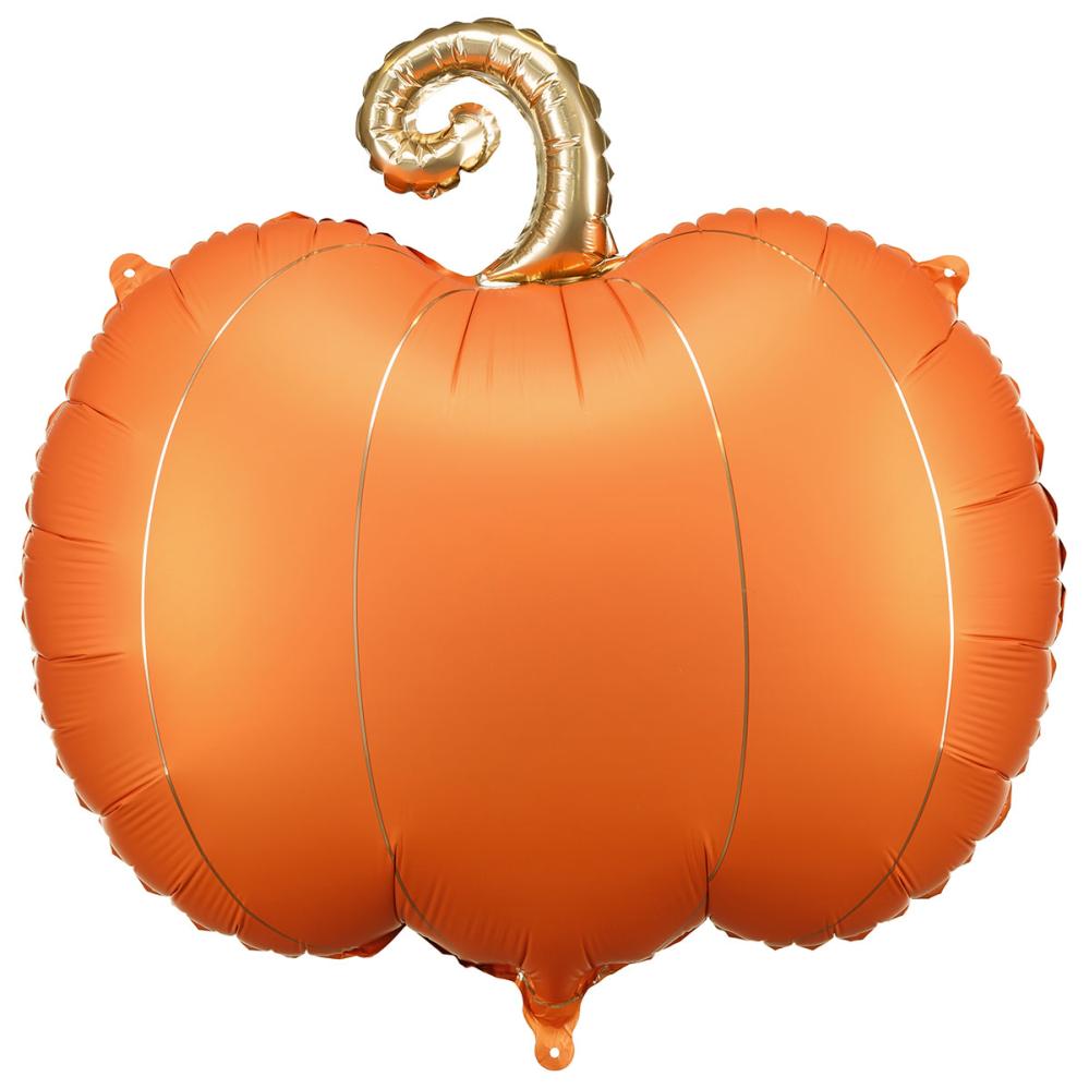 Folieballong Gresskar Oransje/Gull omfatter en folieballong i form av et stripete gresskar i oransje og skimrende gull med en gullfarget stilk. Ballongen kan fylles med luft med det medfølgende blåserøret eller med helium.
