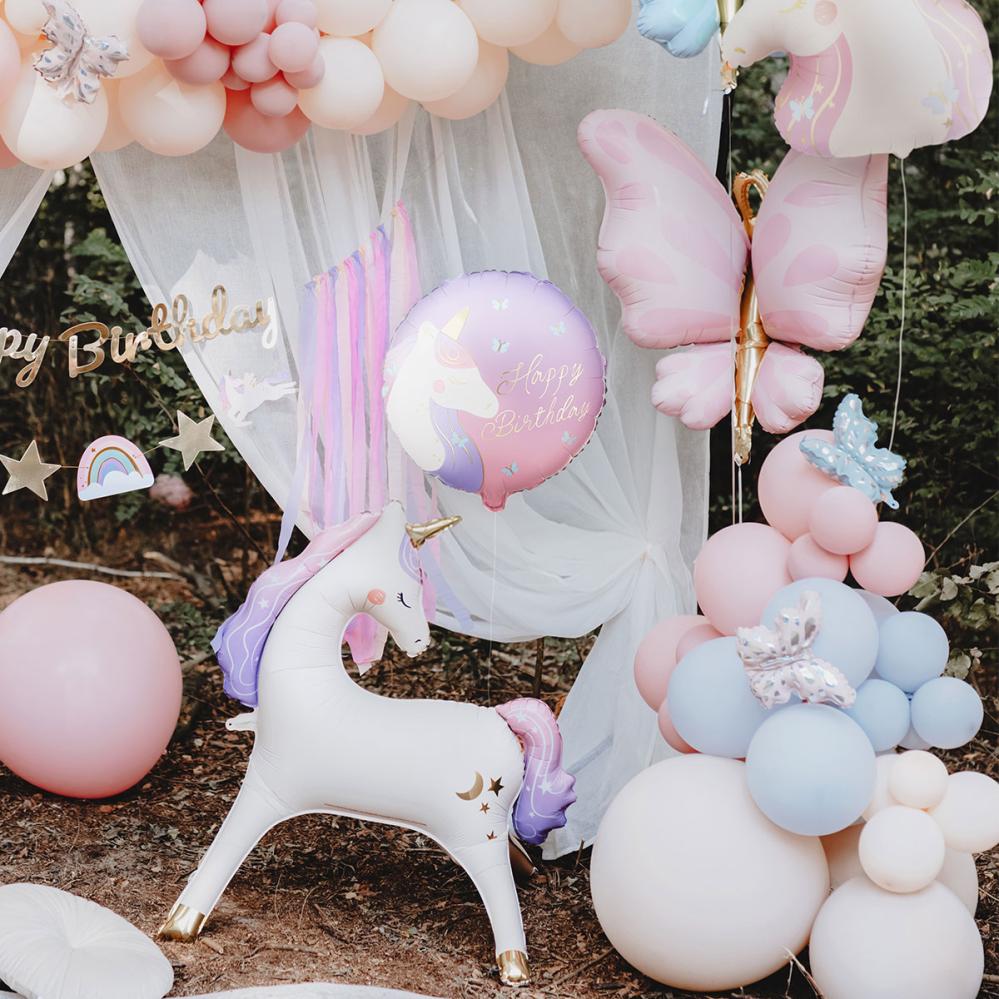 Som bursdagsballong blir denne enhjørningsballongen et lekent valg når selskapets tema er enhjørning, og en rund Happy Birthday ballong får hver bursdag til å føles som begynnelsen på et eventyrkapittel.
