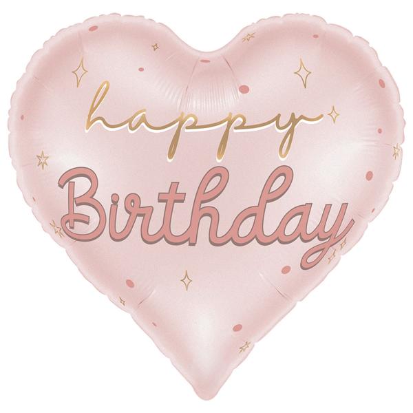 Folieballong Hjerte Happy Birthday inneholder en lyserosa, hjerteformet ballong med teksten 'happy' i gull og 'Birthday' i gammelrosa.