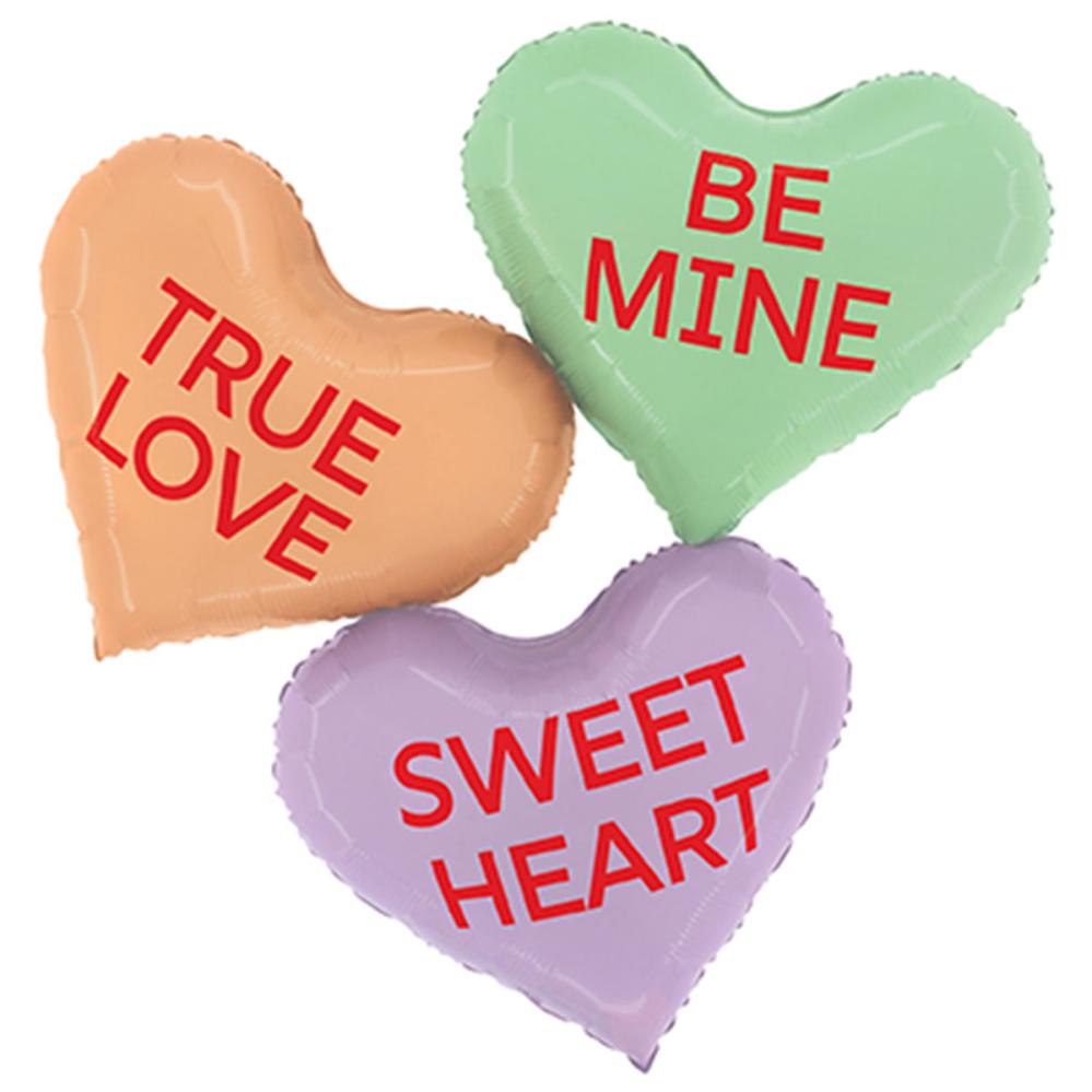Folieballong Hjerter med Tekster omfatter en stor ballong som består av tre sammenkoblede hjerter i ulike farger med rød tekst på for- og bakside. På forsiden av ballongene står det: ”BE MINE”, ”TRUE LOVE” og ”SWEETHEART”. På baksiden står det ”CUTIE”, ”I LOVE YOU” og ”XOXO”.