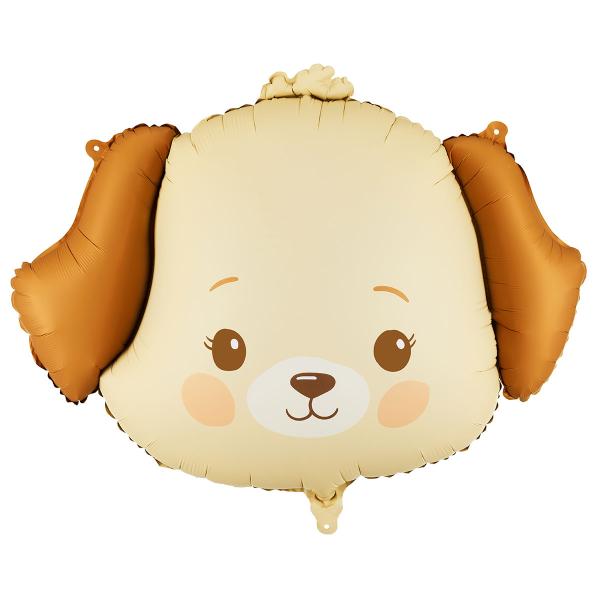 Folieballong Hund 63 x 48,5 cm inneholder en folieballong i form av et søtt hundeansikt i beige og brune nyanser. Den kan fylles med luft eller helium og leveres med et sugerør for oppblåsing.