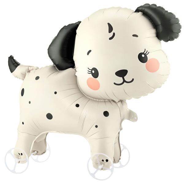 Folieballong Hund på Hjul 70 x 59 cm omfatter en lys beige folieballong med svarte detaljer i form av en søt hundevalp. Ballongen er utformet for å stå på bakken når den er oppblåst og kan flyttes rundt takket være de medfølgende hjulene og snoren. Den fylles kun med luft og kan enkelt blåses opp med det medfølgende sugerøret eller med en ballongpumpe for raskere oppblåsing.