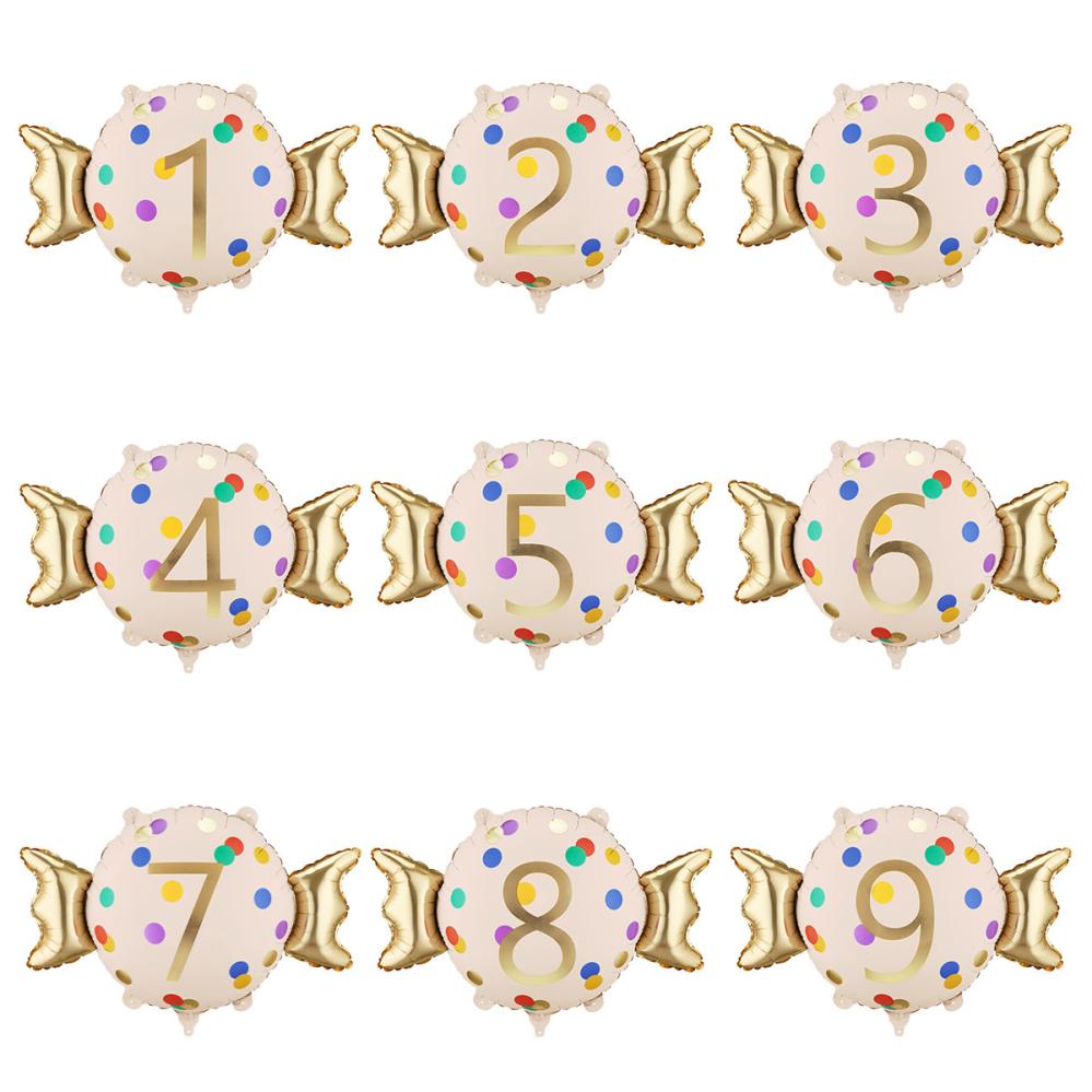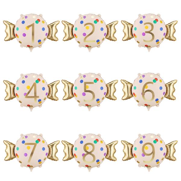 Folieballong Karamell med Tall består av en krem- og gullfarget folieballong i form av en godterikaramell, dekorert med fargerike prikker og et tall i gullfarge. Kan fylles med luft eller helium og leveres med et sugerør for oppblåsing.