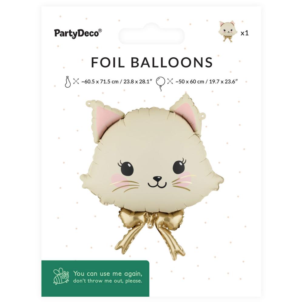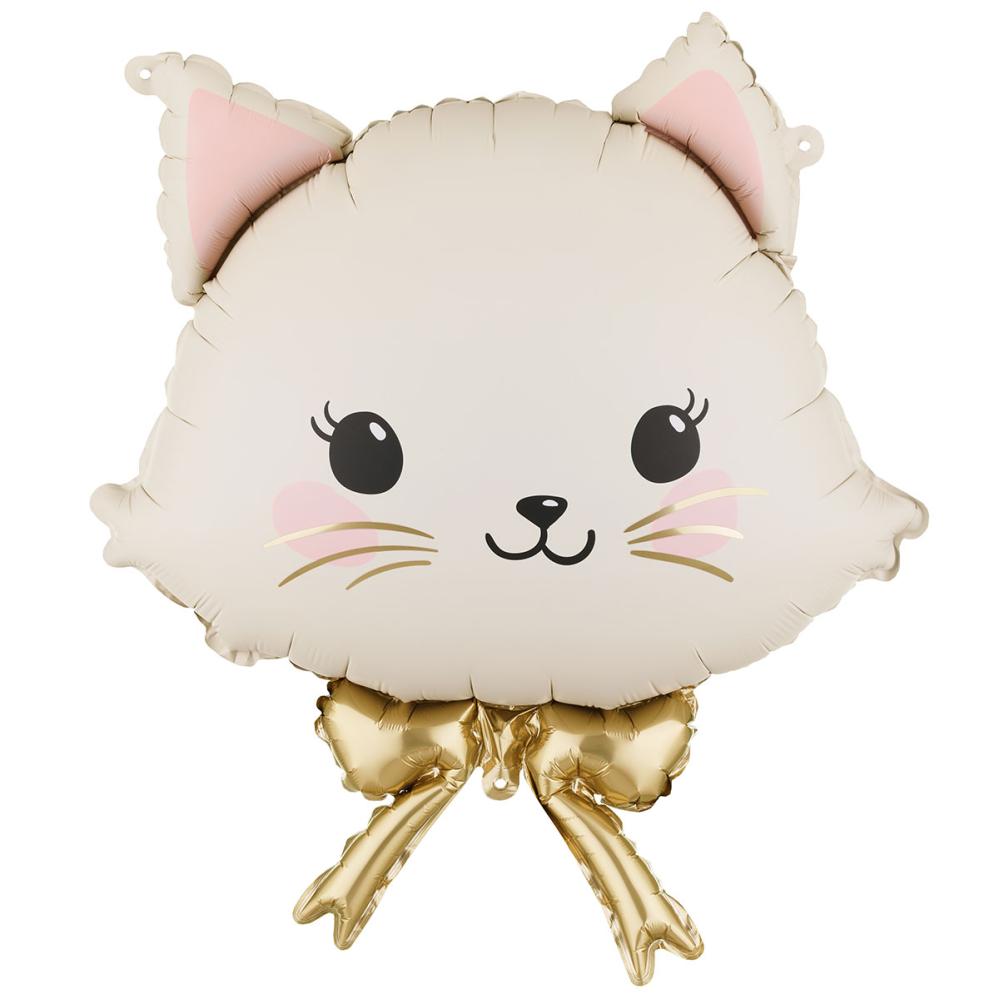 Folieballong Katt med Sløyfe 50 x 60 cm omfatter en folieballong formet som et søtt kremfarget katteansikt med rosa detaljer og en gullfarget sløyfe. Den kan fylles med luft eller helium og leveres med et sugerør for oppblåsing.