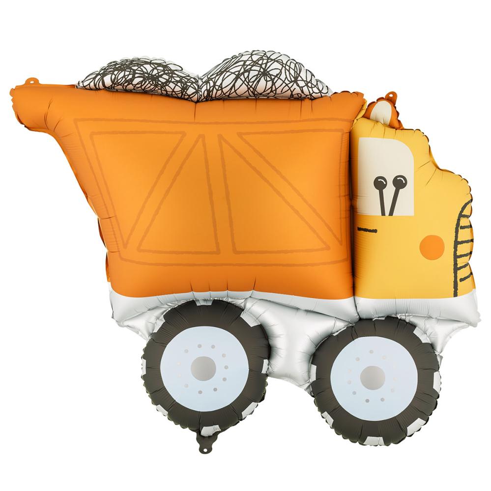 Folieballong Lastebil 87 x 69 cm er en ballong formet som en gul lastebil med oransje last og svarte dekk. Ballongen fylles med luft via det medfølgende blåserøret eller med helium.