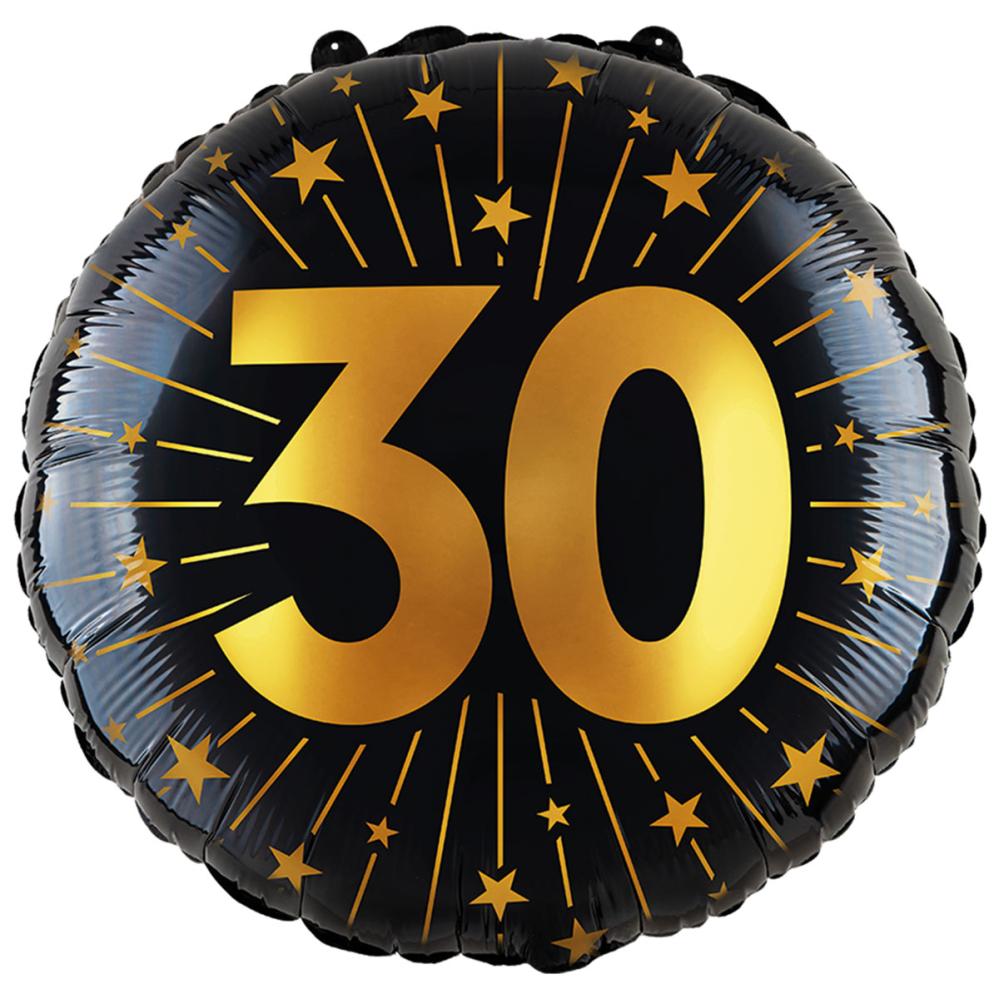 Folieballong med Stjerner og Tallet 30 omfatter en rund folieballong med strålende stjerner og tallet ”30” i gull mot svart bakgrunn.