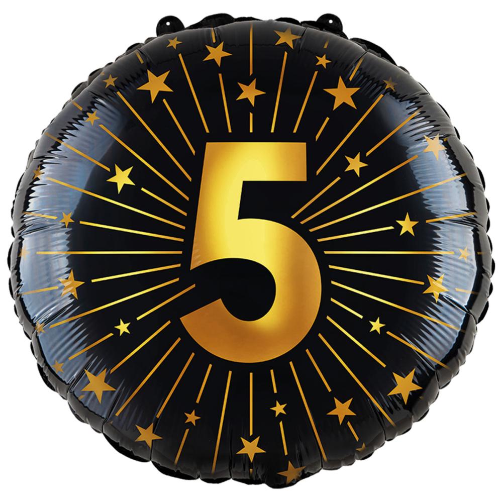 Folieballong med Stjerner og Tallet 5 er en rund folieballong med strålende stjerner og tallet ”5” i gull mot svart bakgrunn.