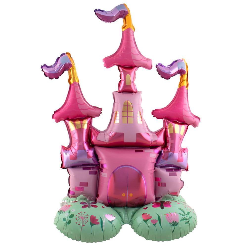 Folieballong Prinsesseslott Stående 65 x 90 cm er en selvstående folieballong formet som et prinsesseslott. Slottet er rosa og står på en grønn gressflekk med ulike blomster på. Ballongen fylles med luft ved hjelp av det medfølgende blåserøret.