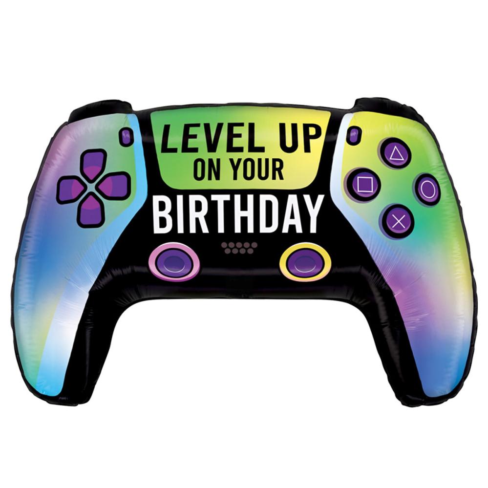 Feir med en fargerik happy birthday ballong formet som en spillkontroll. Denne folieballongen har en regnbueeffekt og teksten Level Up On Your Birthday i svart og hvitt. Perfekt bursdagsballong til en barnebursdag og et must blant ballonger til en gamingbursdag.