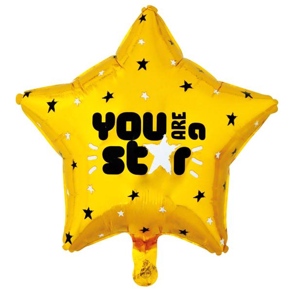 Folieballong Stjerne You Are A Star 46 cm omfatter en gullfarget folieballong som er formet som en stjerne og har motiv av små hvite og svarte stjerner samt teksten ”YOU ARE a star” i svart der bokstaven a i ordet star er erstattet av en hvit stjerne.