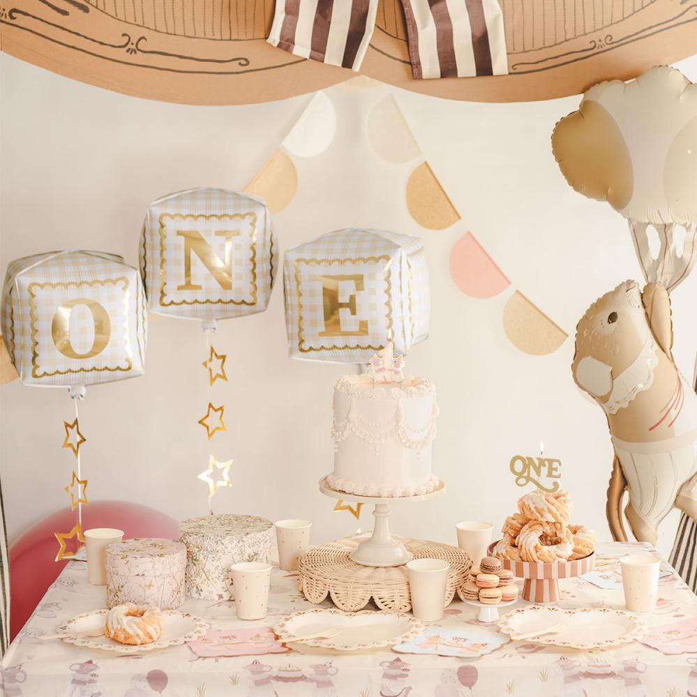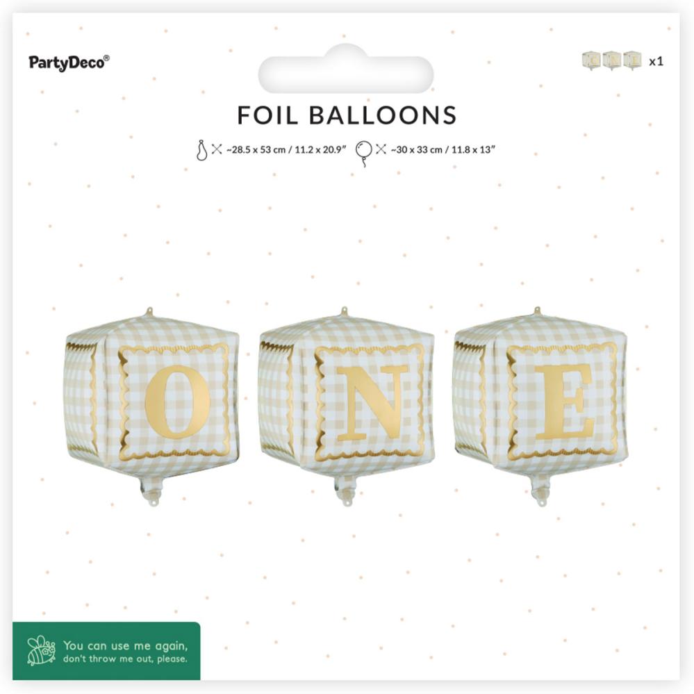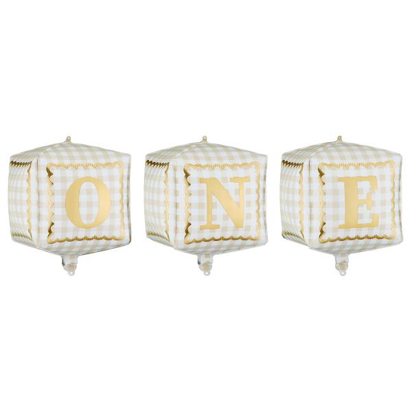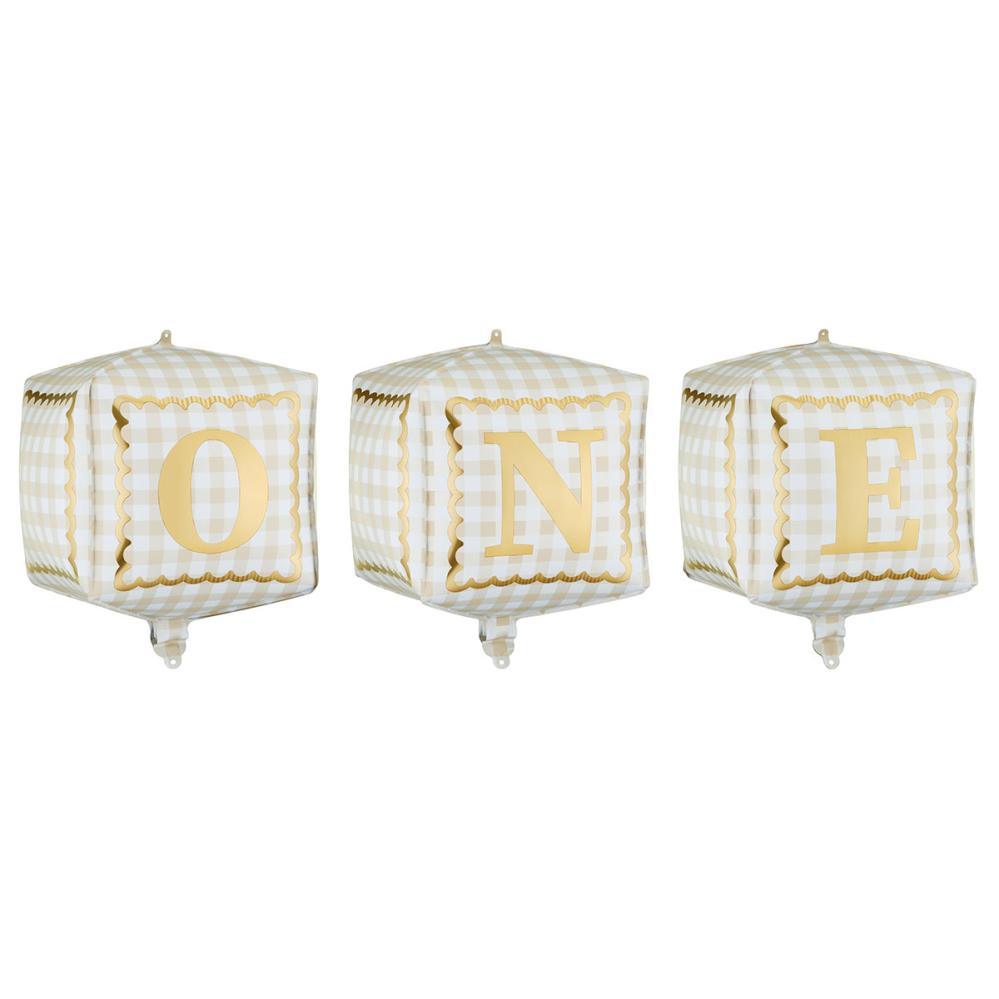 Folieballonger One Kuber 3-pakning omfatter et sett som inneholder tre kubeformede ballonger i kremfarge med et rutete mønster og gulldetaljer. Hver ballong er dekorert med en stor gullfarget bokstav, og sammen danner ballongene ordet 'ONE' når de plasseres ved siden av hverandre. De kan fylles med luft eller helium og leveres med et sugerør for oppblåsing.