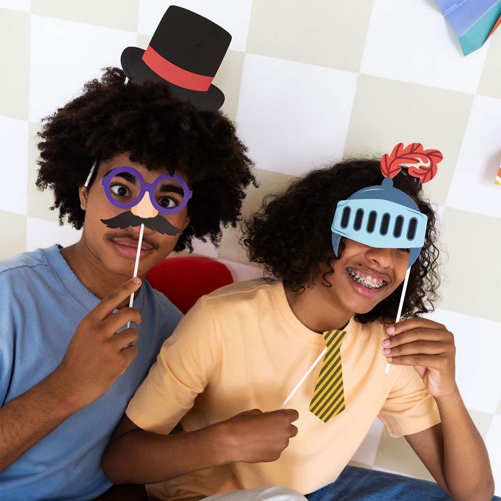 Kalas fotorekvisitter på pinne i fantasifulle motiv som ridderhjelm, kongekrone og pirathatt gjør hvert bilde uforglemmelig. Perfekt som fotorekvisitter til fest eller fotoboksrekvisitter som barn kommer til å elske å leke med.