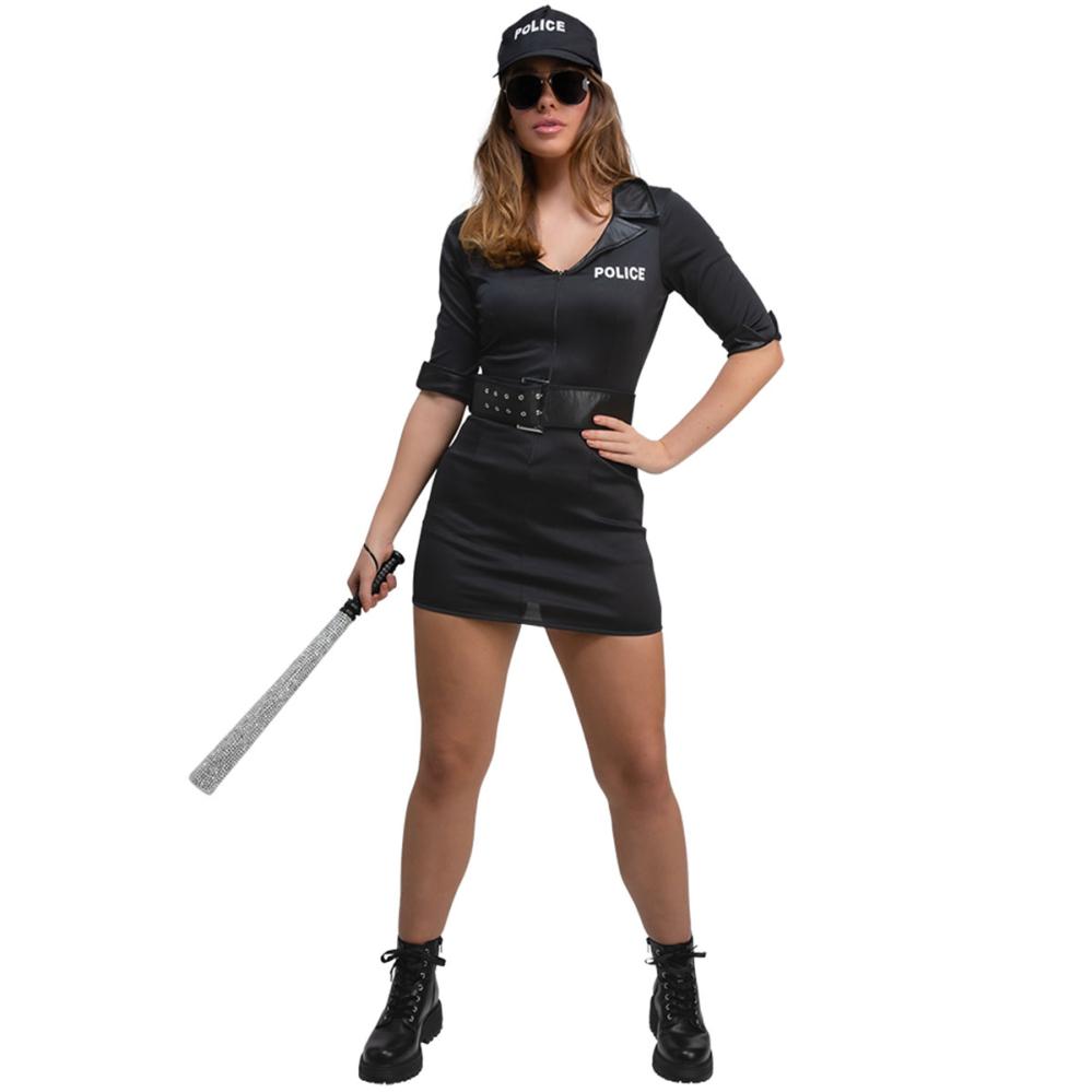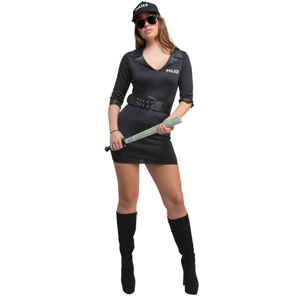 Frekk Politikvinne Kostyme omfatter en kort svart kjole med glidelås foran, halvlange ermer og teksten ”POLICE” skrevet på brystet. Det medfølger også en matchende svart caps med teksten ”POLICE” samt et svart belte med et sølvfarget spenne laget i metall.