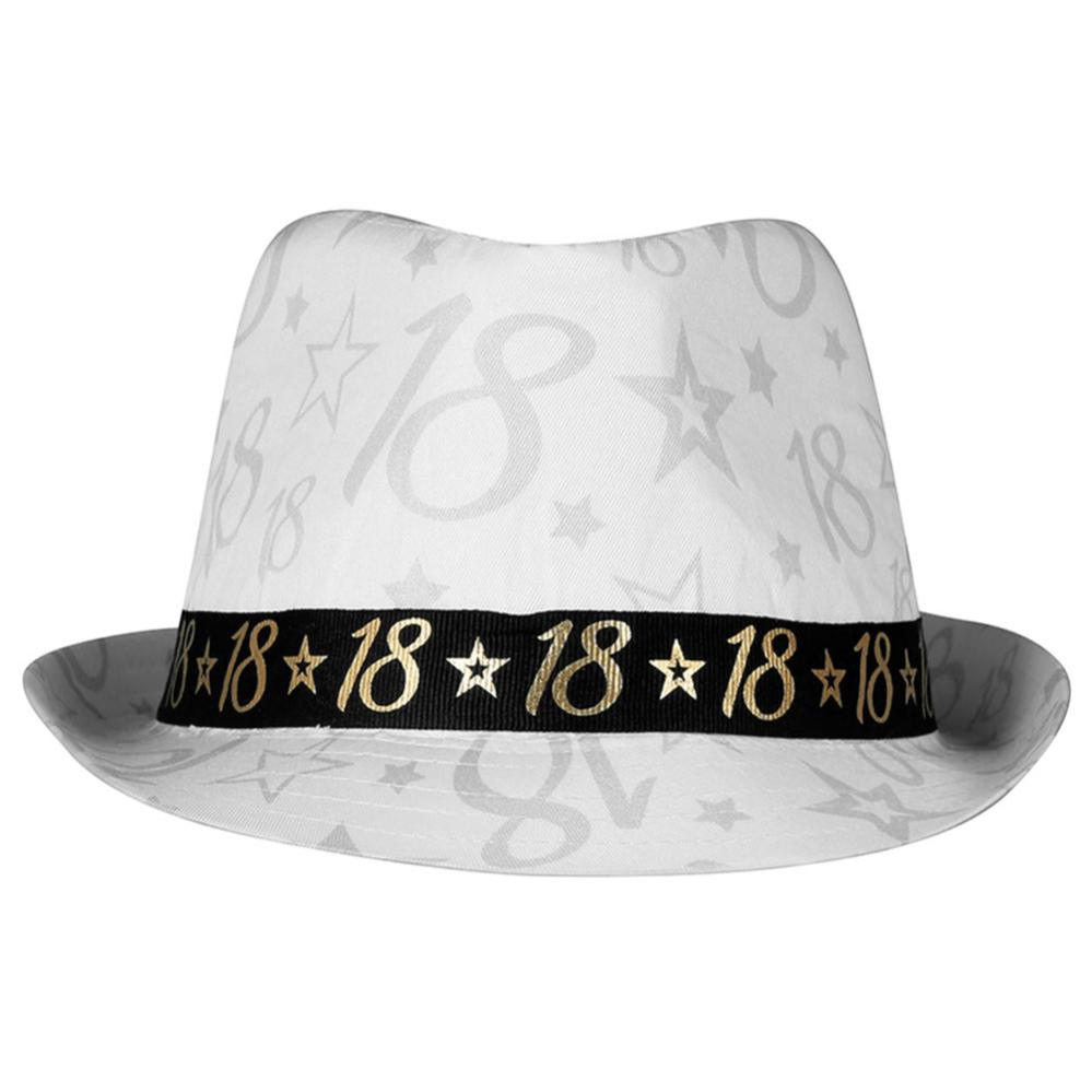 Gangsterhatt 18 år omfatter en hvit gangsterhatt med motiv av tallet 18 og stjerner, trykt i grått direkte på hatten og i gull på det svarte båndet rundt.
