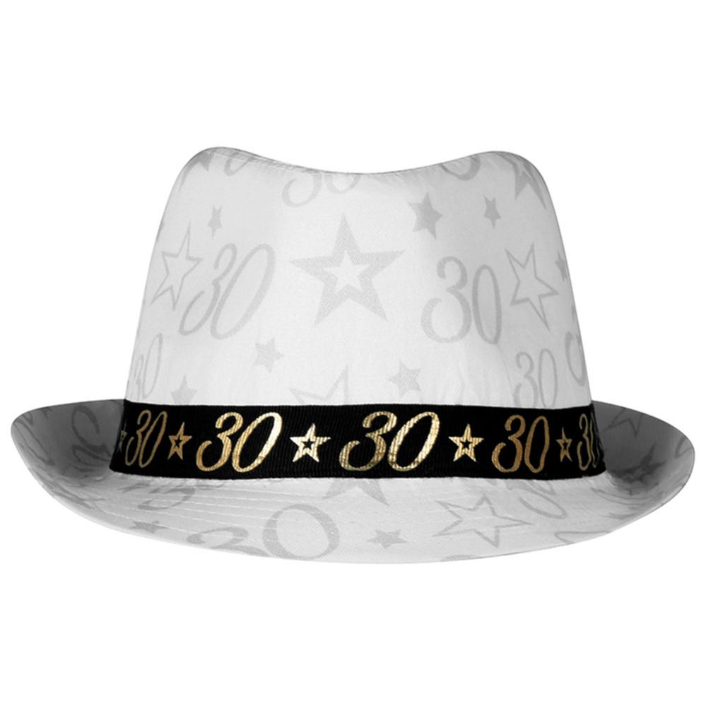 Gangsterhatt 30 år omfatter en hvit gangsterhatt med motiv av tallet 30 og stjerner, trykt i grått direkte på hatten og i gull på det svarte båndet rundt om.