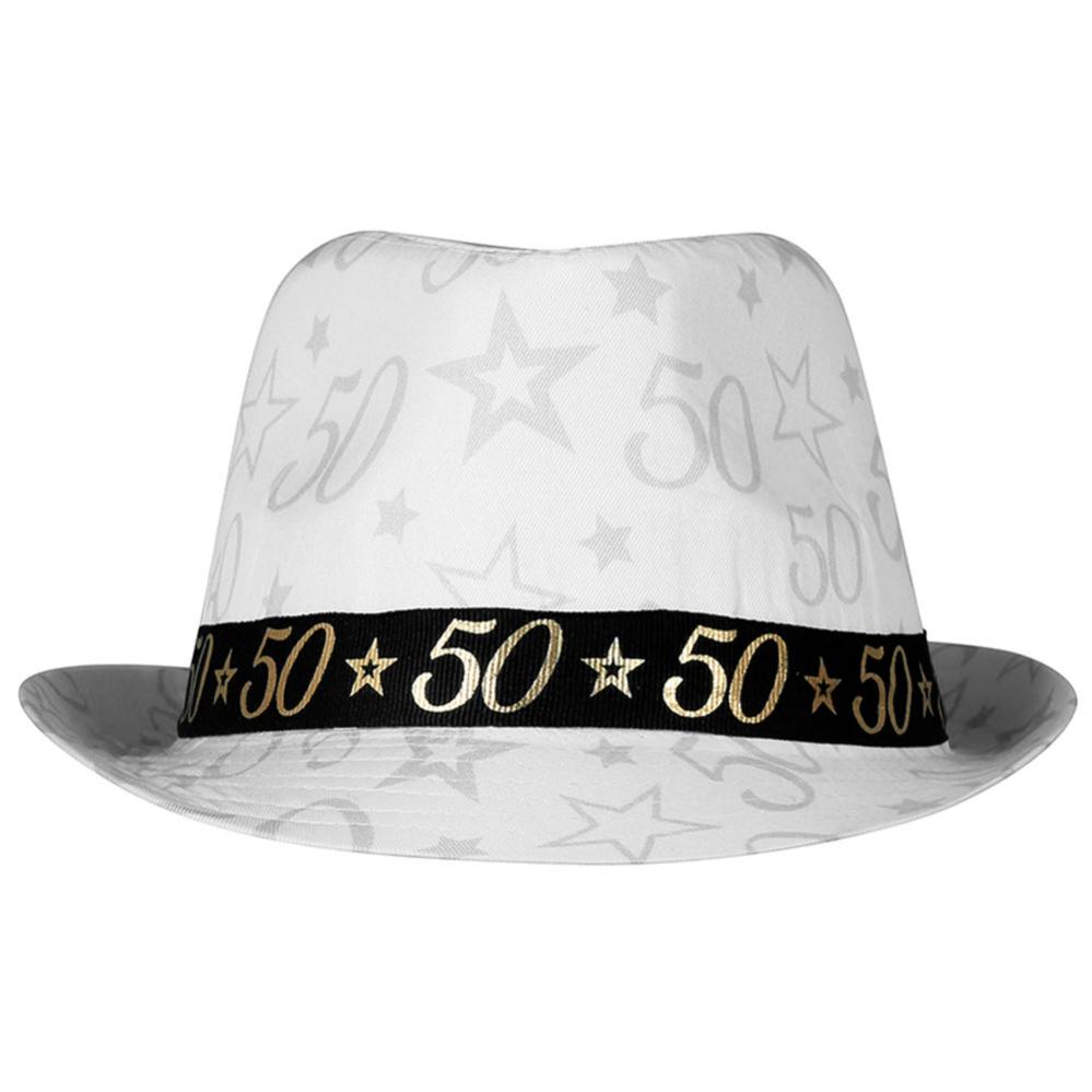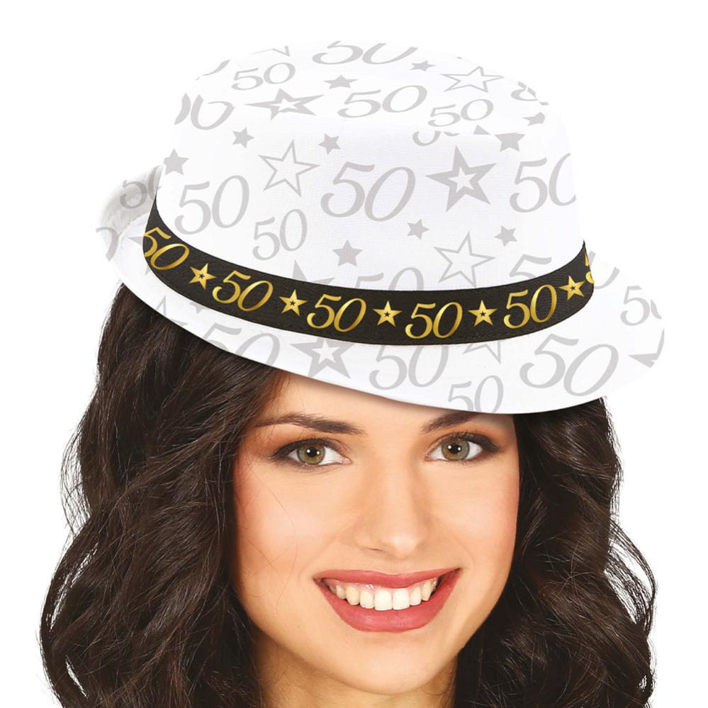 Gangsterhatt 50 år omfatter en hvit gangsterhatt med motiv av tallet 50 og stjerner, trykket i grått direkte på hatten og i gull på det svarte båndet rundt.