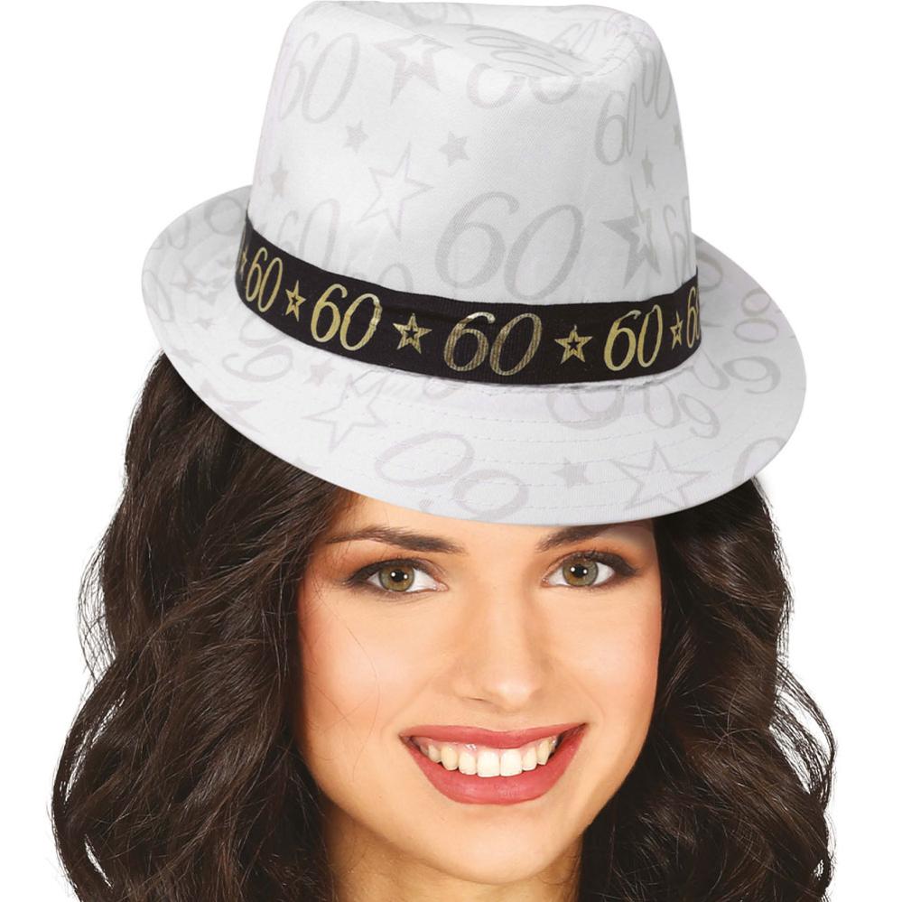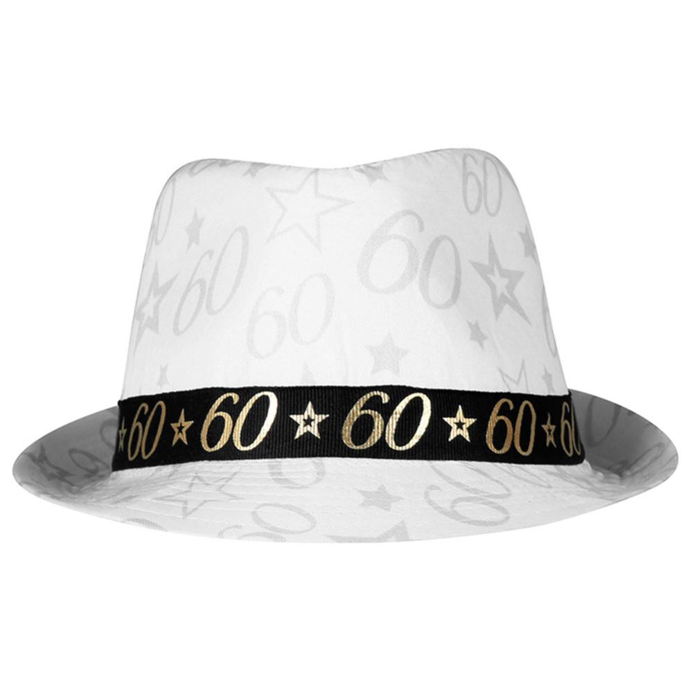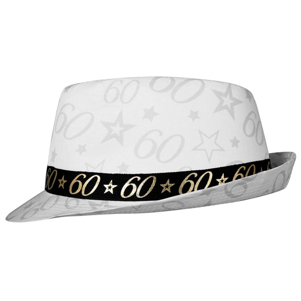 Gangsterhatt 60 år omfatter en hvit gangsterhatt med motiv av tallet 60 og stjerner, trykt i grått direkte på hatten og i gull på det svarte båndet rundt.