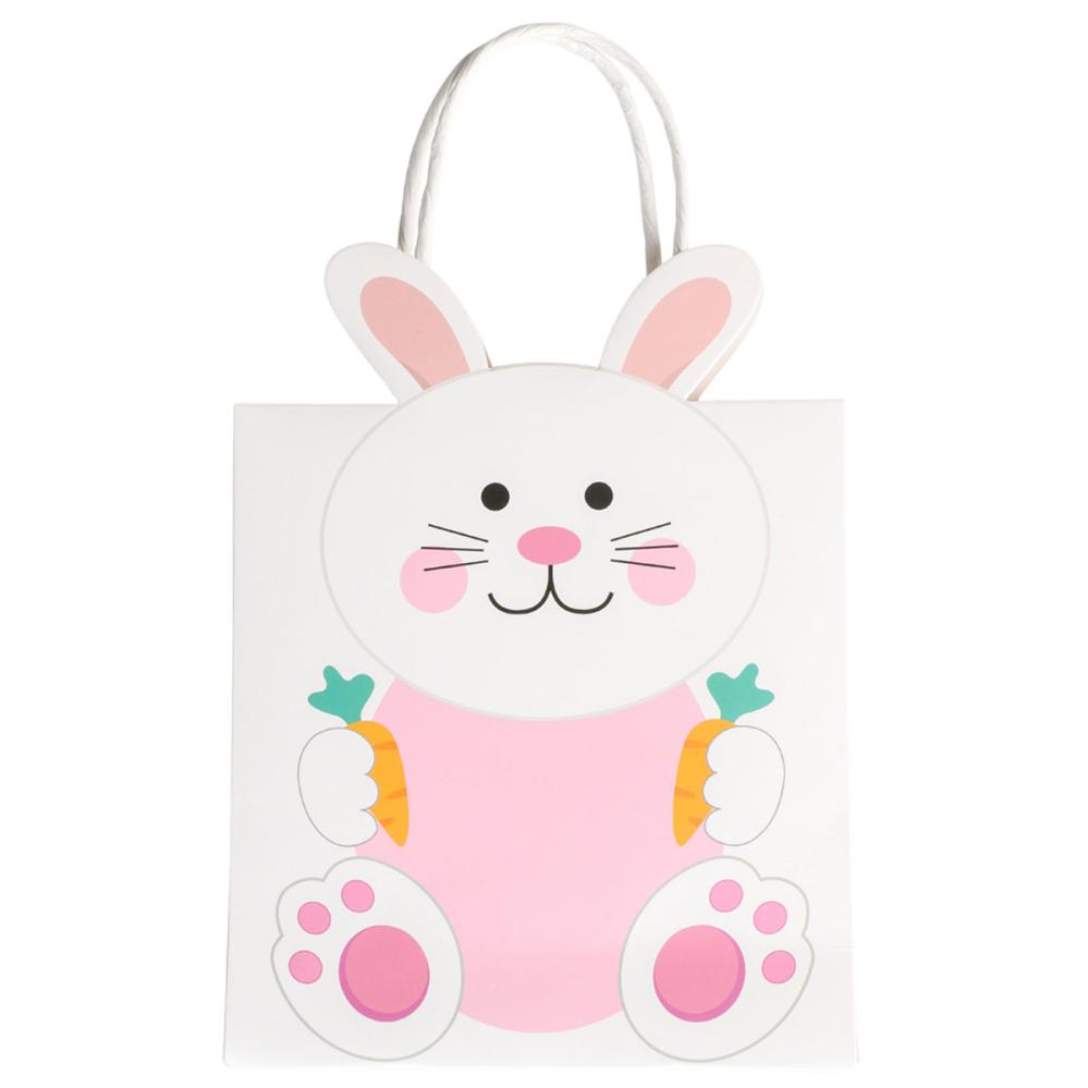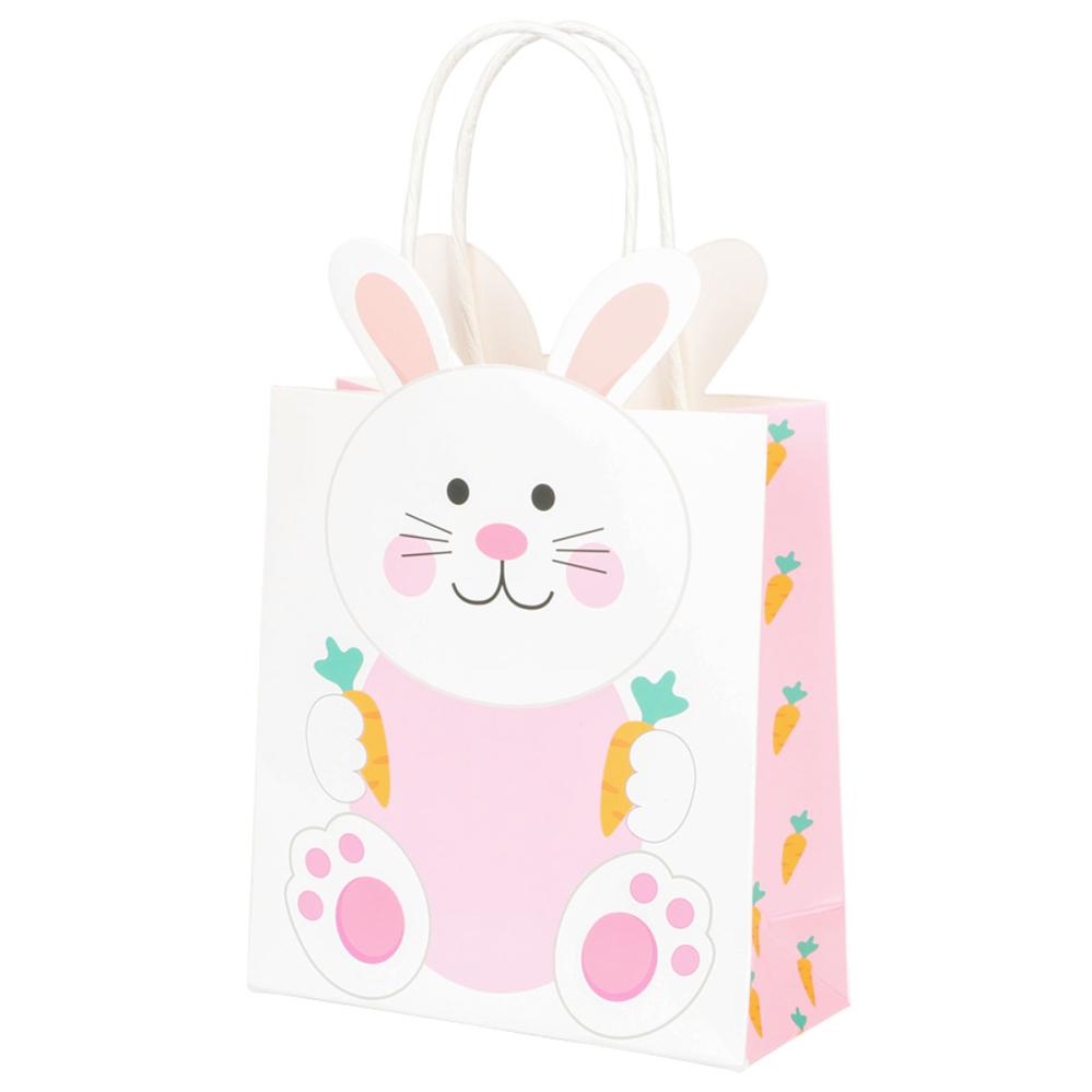 Gavepose Kanin Hvit 12x6x15 cm er en gavepose med motiv av en hvit og rosa kanin som holder to gulrøtter. Posen har oppstikkende kaninører, rosa sider med gulrøtter og hvite bærehåndtak.