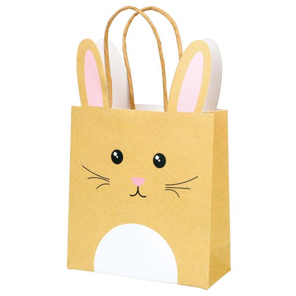 Gavepose Kanin Kraft 12x6x15 cm er en gavepose i en beige nyanse med motiv av en kanin med hvite og rosa detaljer. Posen har oppstikkende kaninører og hvite bærehåndtak.