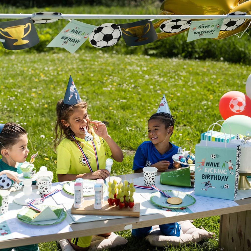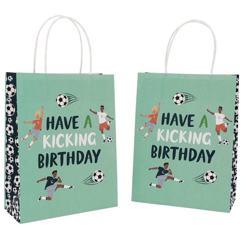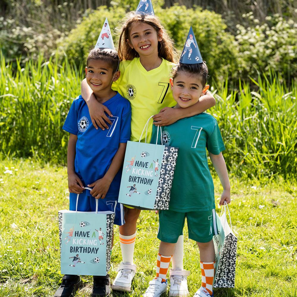 Gaveposer Fotballbursdag 6-pakning består av seks turkise gaveposer med håndtak, der begge sider prydes av motiv med fotballspillere og teksten ”Have A Kicking Birthday”. Kortsidene og undersiden er i en mørkeblå nyanse, og på sidene finnes også motiv av fotballer.