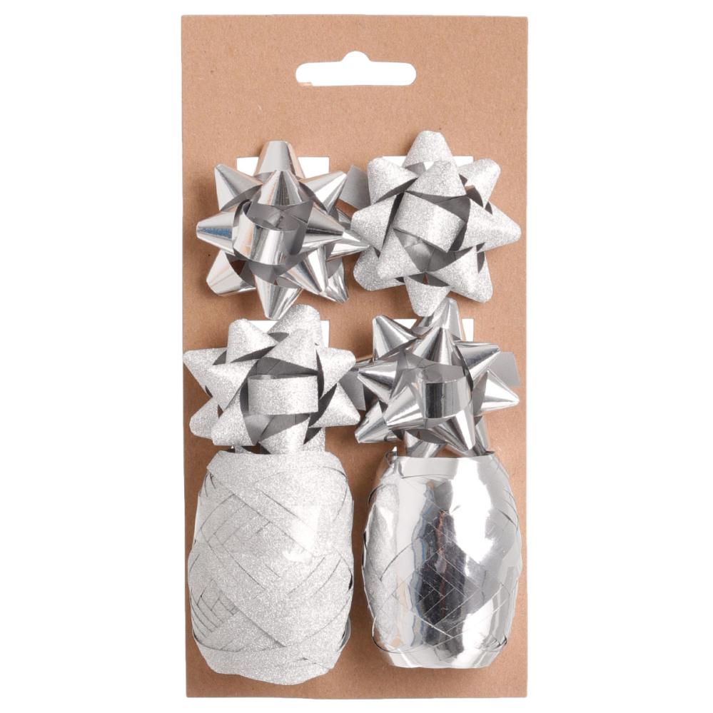 Gavesnor og Sløyfe Sett Sølv omfatter et sølvfarget gaveinnpakkingssett med en skimrende gavesnor, en gavesnor med glitter, to skimrende gavesløyfer og to gavesløyfer med glitter.