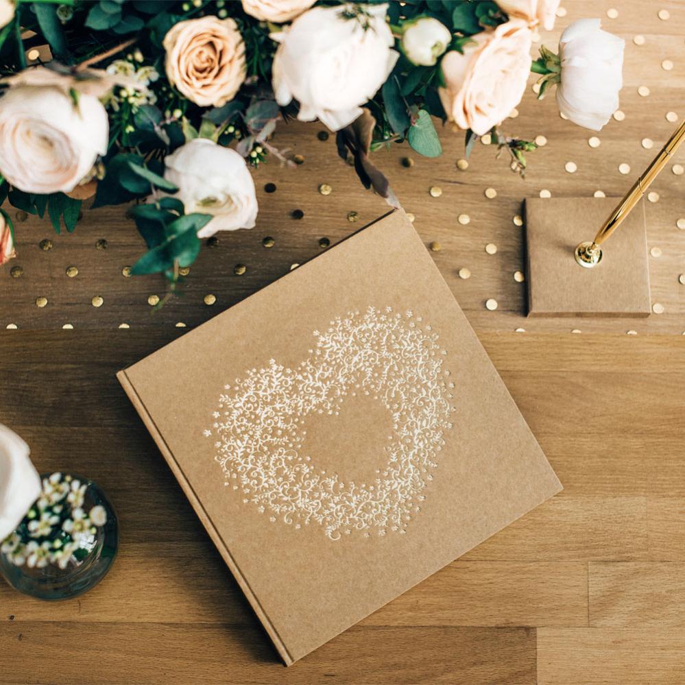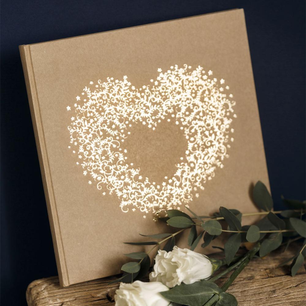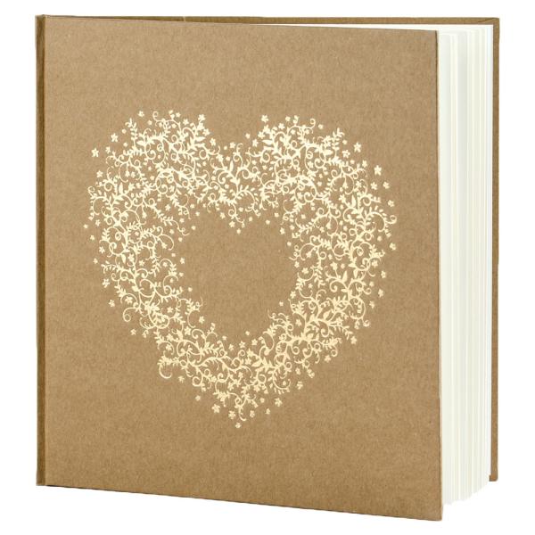 Gjestebok med Hjerte omfatter en brun gjestebok med gyllent hjerte på forsiden. Boken er ca 20,5 x 20,5 cm stor og har 22 stk blanke sider.