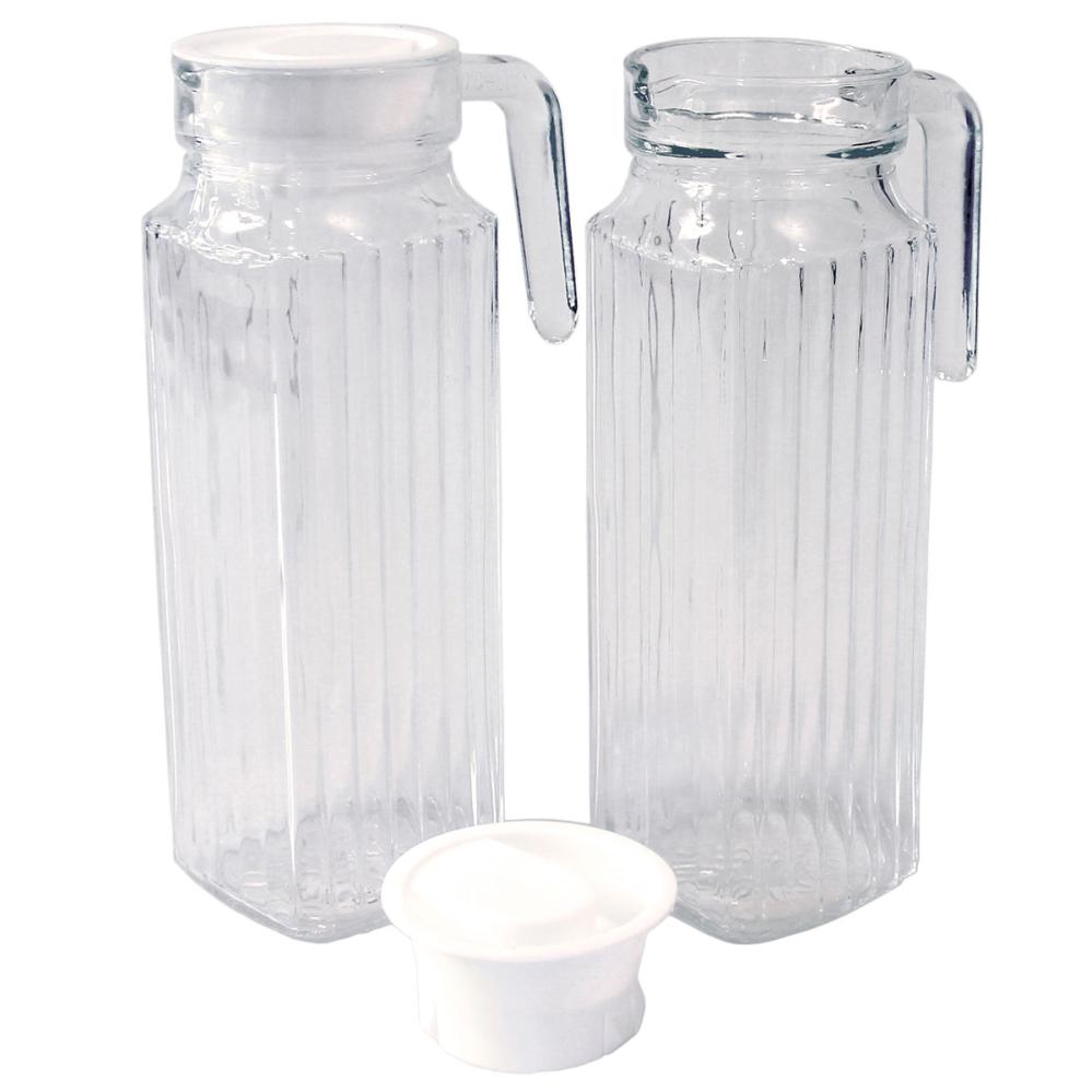 Glasskanne med Lokk 1 Liter består av en glasskanne med håndtak og plastlokk, og den firkantede formen gjør kannen ideell for oppbevaring i kjøleskapsdøren.