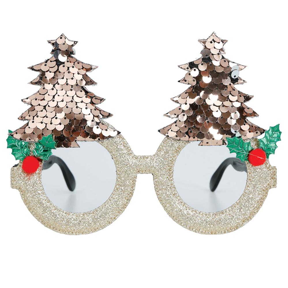 Glitrende Briller med Juletrær er et par runde briller med en gullglitrende front. På hver linsebøyle prydes brillene av et juletre, dekket med paljetter i rosegull. Ved basen av hvert juletre finnes små dekorative detaljer i form av kristtornblader og røde bær.