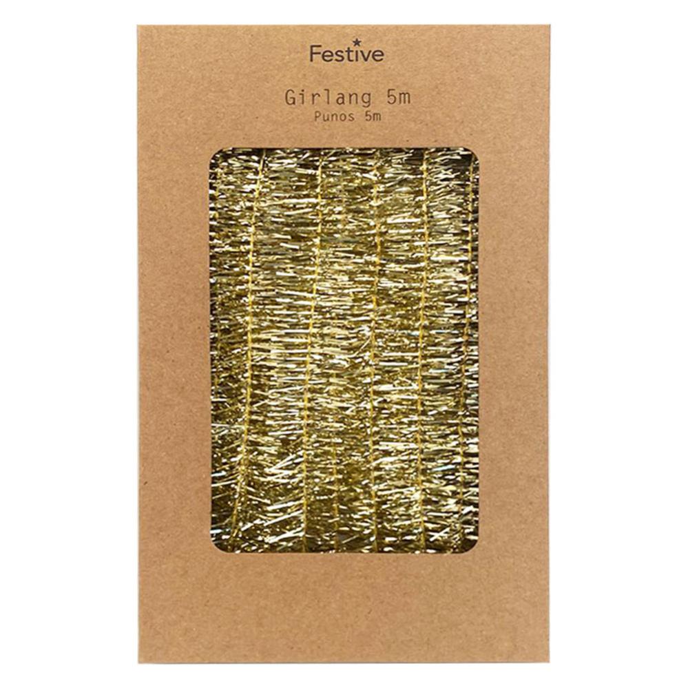 Glitter Girlander til Juletre Gull inneholder en gylden juletre-girlander i plast.