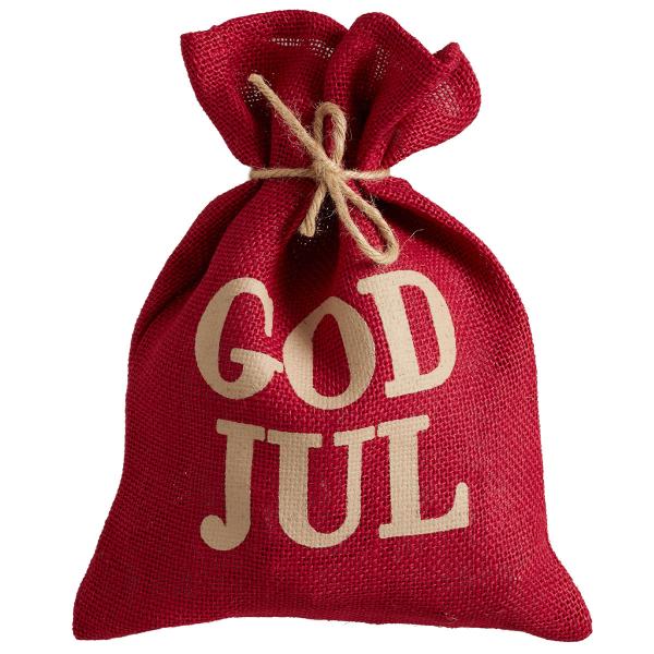 God Jul Julegavesekk 38 cm omfatter en rød julegavesekk i jutestoff med teksten ”God Jul” i beige. Sekken har en beige snor for å stramme åpningen.