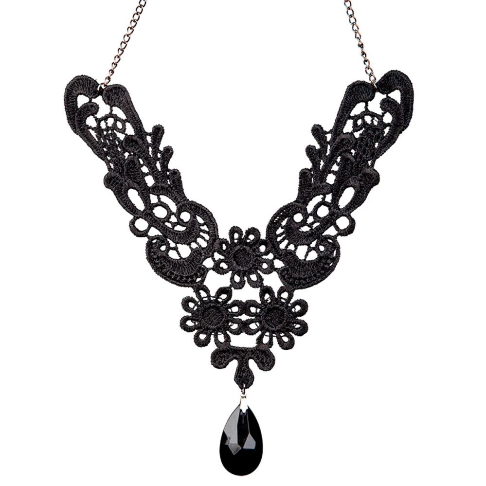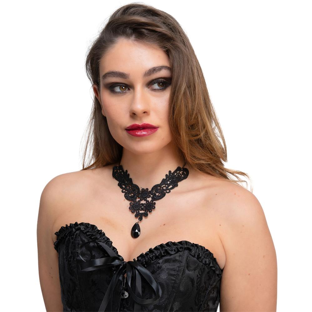 Gotisk Halskjede med Blonder omfatter et halskjede med vakre svarte blondedetaljer foran, prydet med en svart plaststein. Kjedet som tres rundt halsen er justerbart for en behagelig passform.