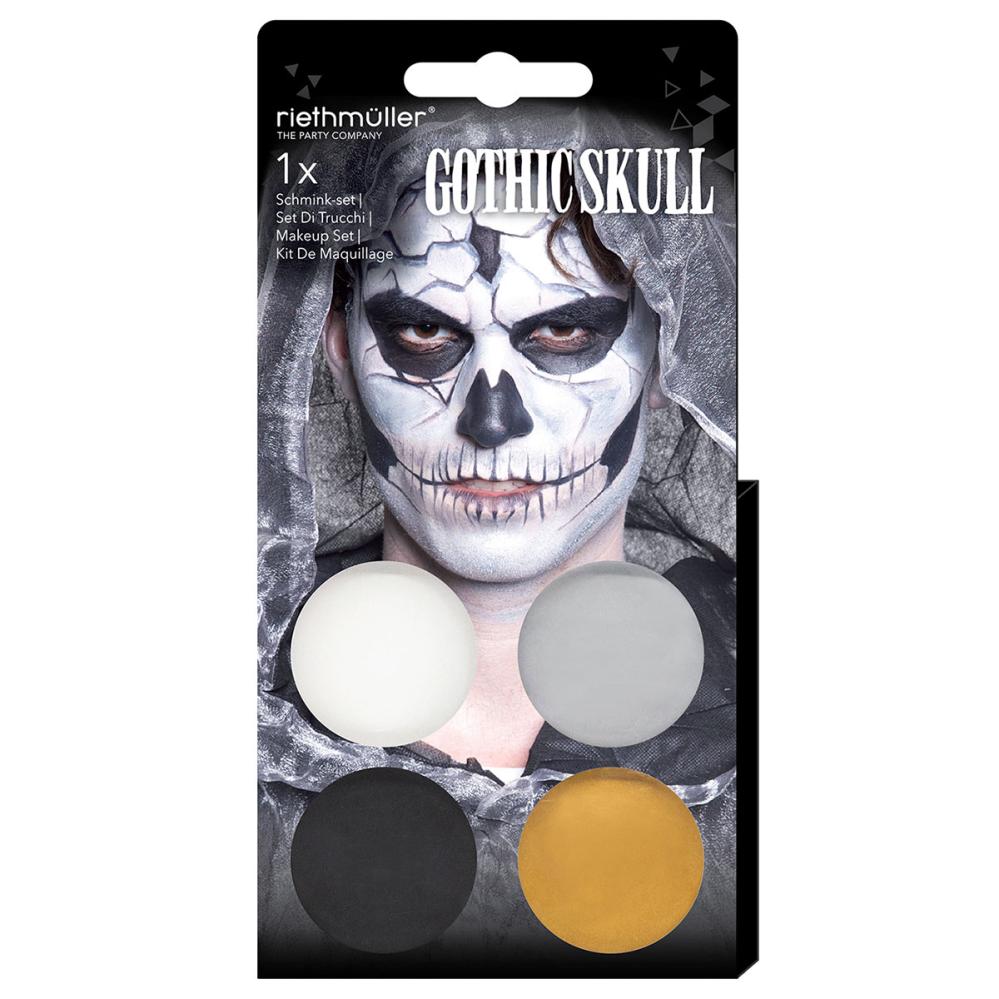 Gotisk Hodeskalle Sminkesett er et sett med alt som trengs for å lage en komplett gotisk hodeskallesminke. Settet inneholder fire vannbaserte farger (svart, hvit, sølv og gull) samt en liten sminkekost. Fargen vaskes enkelt bort med såpe og vann.
