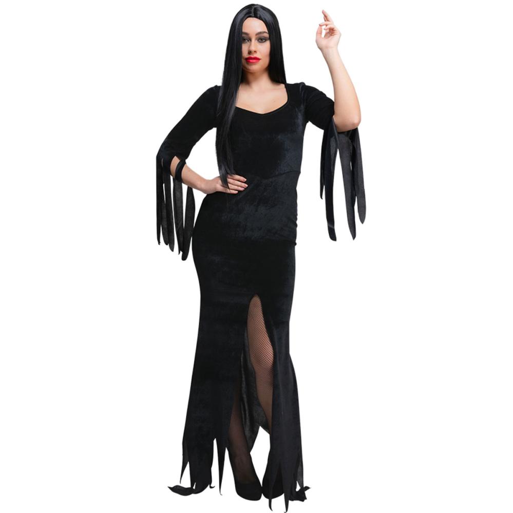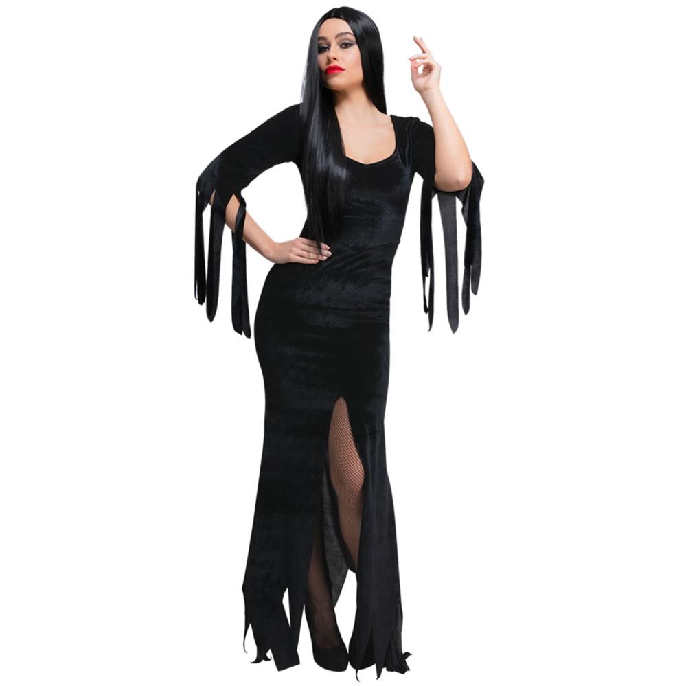 Vekk mørkets dronning i deg med en svart Halloween kjole. Den gotiske heksekostymen med tentakellignende ermer og dramatisk splitt foran er perfekt som Morticia Addams kostyme til Halloween eller andre skumle maskeradefester.