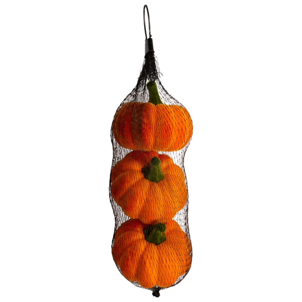 Gresskar Dekorasjon Oransje 3-pakning omfatter en svart nettingpose med tre oransje gresskar som har grønne stilker og er dekket av fløyelslignende polyester.