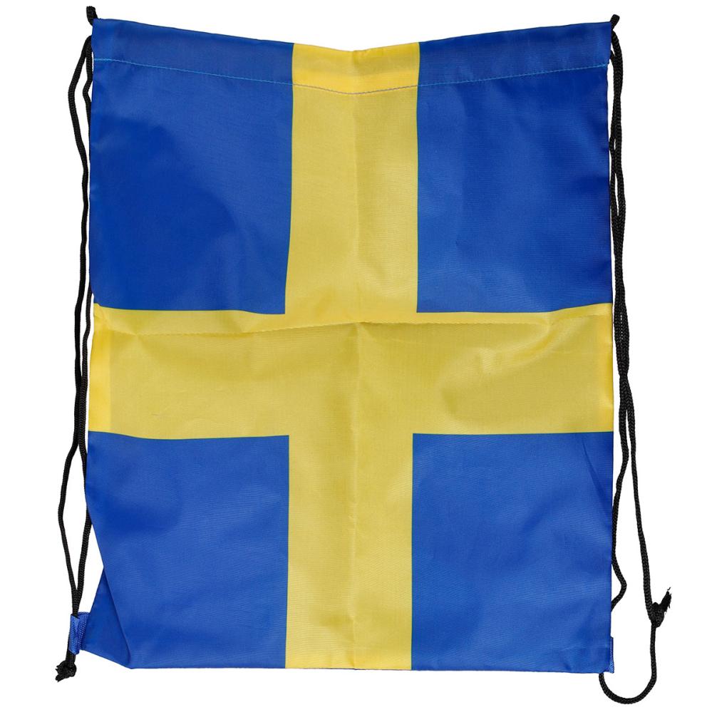 Gympose Sverige 39 x 33 cm omfatter en blå og gul gymnastikkpose med motiv av det svenske flagget. De to blå skuldersnorene fungerer både som bæreremmer og for enkel åpning og lukking.