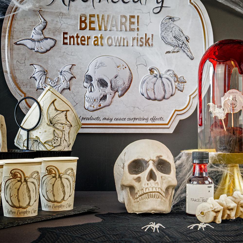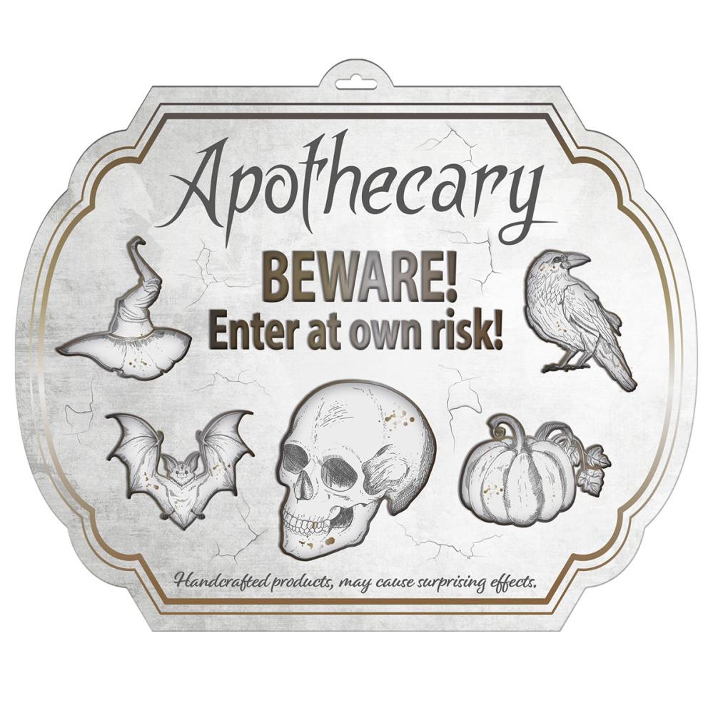 Halloween Dørskilt omfatter et hvitt dekorativt skilt med motiver som stikker ut, noe som gir det en 3D-effekt. Skiltet har motiver av en heksehatt, en flaggermus, en hodeskalle, et gresskar og en ravn. Det står følgende engelske tekster på skiltet: ”Apothecary BEWARE! Enter at own risk!” og ”Handcrafted products, may cause surprising effects”. Skiltet har en åpning i toppen for enkel opphenging og fungerer også perfekt som en veggdekorasjon.