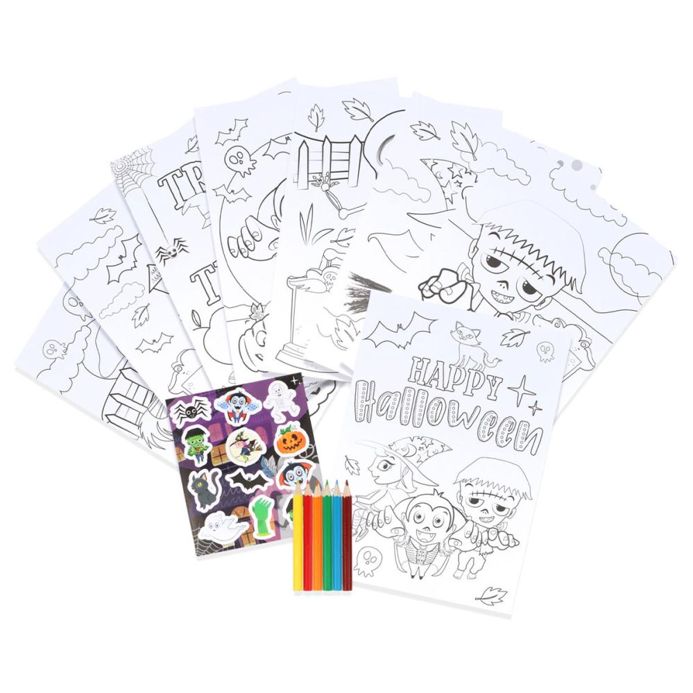 Halloween Fargeleggingssett inkluderer åtte detaljerte A4-ark med halloweenmotiv og seks små fargeblyanter i fargene grønn, blå, gul, oransje, brun og rød. Det følger også med et lite ark med tolv morsomme og fargerike klistremerker som kan brukes til å dekorere ferdige tegninger eller andre overflater.